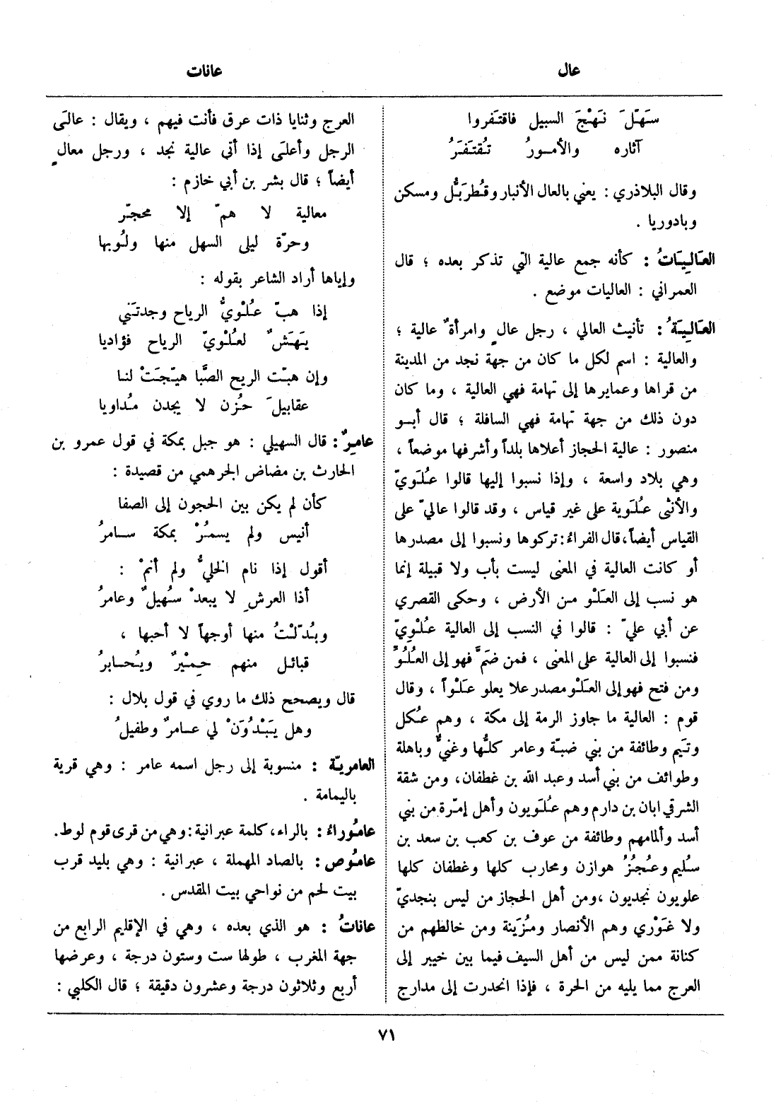 تأنيث العالي، رجل عال وامرأة عالية، والعالية: اسم لكل ما كان من جهة نجد من المدينة من قراها وعمائرها إلى تهامة فهي العالية، وما كان دون ذلك من جهة تهامة فهي السافلة، قال أبو منصور: عالية الحجاز أعلاها بلدا وأشرفها موضعا، وهي بلاد واسعة، وإذا نسبوا إليها قالوا علويّ والأنثى علوية على غير قياس، وقد قالوا عاليّ على القياس أيضا، قال الفراء: تركوها ونسبوا إلى مصدرها أو كانت العالية في المعنى ليست بأب ولا قبيلة إنما هو نسب إلى العلو من الأرض، وحكى القصري عن أبي عليّ: قالوا في النسب إلى العالية علويّ فنسبوا إلى العالية على المعنى، فمن ضمّ فهو إلى العلوّ ومن فتح فهو إلى العلو مصدر علا يعلو علوا، وقال قوم: العالية ما جاوز الرمة إلى مكة، وهم عكل وتيم وطائفة من بني ضبّة وعامر كلّها وغنيّ وباهلة وطوائف من بني أسد وعبد الله بن غطفان، ومن شقة الشرقي ابان بن دارم وهم علويون وأهل إمّرة من بني أسد وألمامهم وطائفة من عوف بن كعب بن سعد بن سليم وعجز هوازن ومحارب كلها وغطفان كلها علويون نجديون، ومن أهل الحجاز من ليس بنجديّ ولا غوري وهم الأنصار ومزينة ومن خالطهم من كنانة ممن ليس من أهل السيف فيما بين خيبر إلى العرج مما يليه من الحرة، فإذا انحدرت إلى مدارج العرج وثنايا ذات عرق فأنت فيهم، ويقال: عالى الرجل وأعلى إذا أتى عالية نجد، ورجل معال أيضا، قال بشر بن أبي خازم: