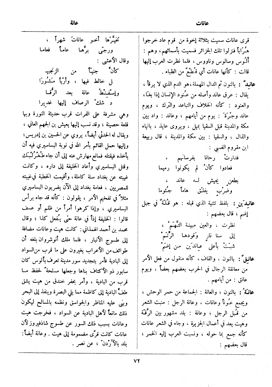 بالنون، والعانة: الجماعة من حمر الوحش، ويجمع عونا وعانات، وعانة الرجل: منبت الشعر من قبل الرجل، وعانة: بلد مشهور بين الرّقّة وهيت يعد في أعمال الجزيرة، وجاء في الشعر عانات كأنه جمع بما حوله، ونسبت العرب إليه الخمر، قال بعضهم: