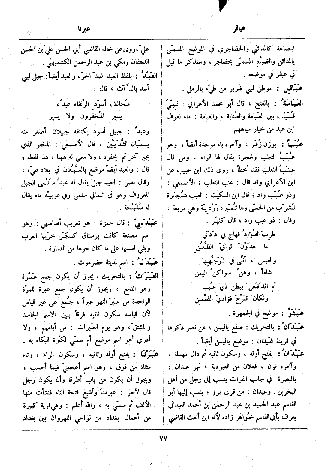 بالتحريك، يجوز أن يكون جمع عبرة وهو الدمع، ويجوز أن يكون جمع عبرة للمرّة الواحدة من عبر النهر عبرا، جمع على غير قياس لأن قياسه سكون ثانيه فرقا بين الاسم الجامد والمشتقّ، وهو يوم العبرات: من أيامهم، ولا أدري أهو اسم موضع أم سمّي لكثرة البكاء به.
