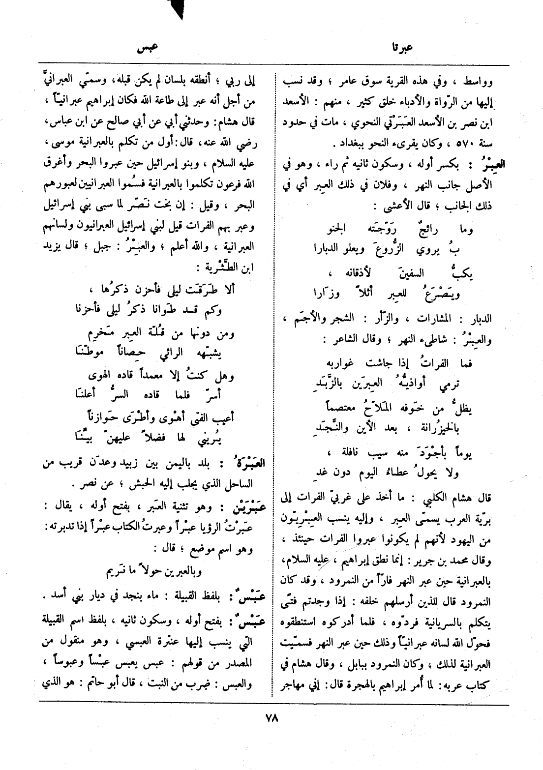 قال هشام الكلبي: ما أخذ على غربيّ الفرات إلى بريّة العرب يسمّى العبر، وإليه ينسب العبريّون من اليهود لأنهم لم يكونوا عبروا الفرات حينئذ، وقال محمد بن جرير: إنما نطق إبراهيم، عليه السّلام، بالعبرانية حين عبر النهر فارّا من النمرود، وقد كان النمرود قال للذين أرسلهم خلفه: إذا وجدتم فتى يتكلم بالسريانية فردّوه، فلما أدركوه استنطقوه فحوّل الله لسانه عبرانيّا وذلك حين عبر النهر فسمّيت العبرانية لذلك، وكان النمرود ببابل، وقال هشام في كتاب عربه: لما أمر إبراهيم بالهجرة قال: إني مهاجر إلى ربي، أنطقه بلسان لم يكن قبله، وسمّي العبرانيّ من أجل أنه عبر إلى طاعة الله فكان إبراهيم عبرانيّا، قال هشام: وحدثني أبي عن أبي صالح عن ابن عباس، رضي الله عنه، قال: أول من تكلم بالعبرانية موسى، عليه السّلام، وبنو إسرائيل حين عبروا البحر وأغرق الله فرعون تكلموا بالعبرانية فسموا العبرانيين لعبورهم البحر، وقيل: إن بخت نصّر لما سبى بني إسرائيل وعبر بهم الفرات قيل لبني إسرائيل العبرانيون ولسانهم العبرانية، والله أعلم، والعبر: جبل، قال يزيد ابن الطّثرية: