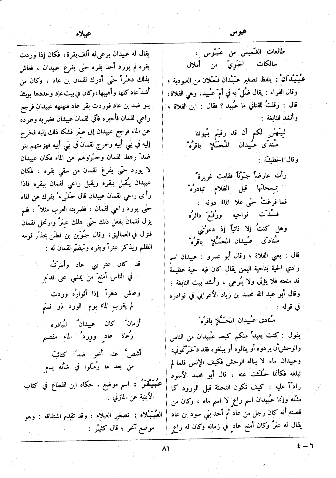 قال: يعني الفلاة، وقال أبو عمرو: عبيدان اسم وادي الحية بناحية اليمن يقال كان فيه حية عظيمة قد منعته فلا يؤتى ولا يرعى، وأنشد بيت النابغة، وقال أبو عبد الله محمد بن زياد الأعرابي في نوادره في قوله:
