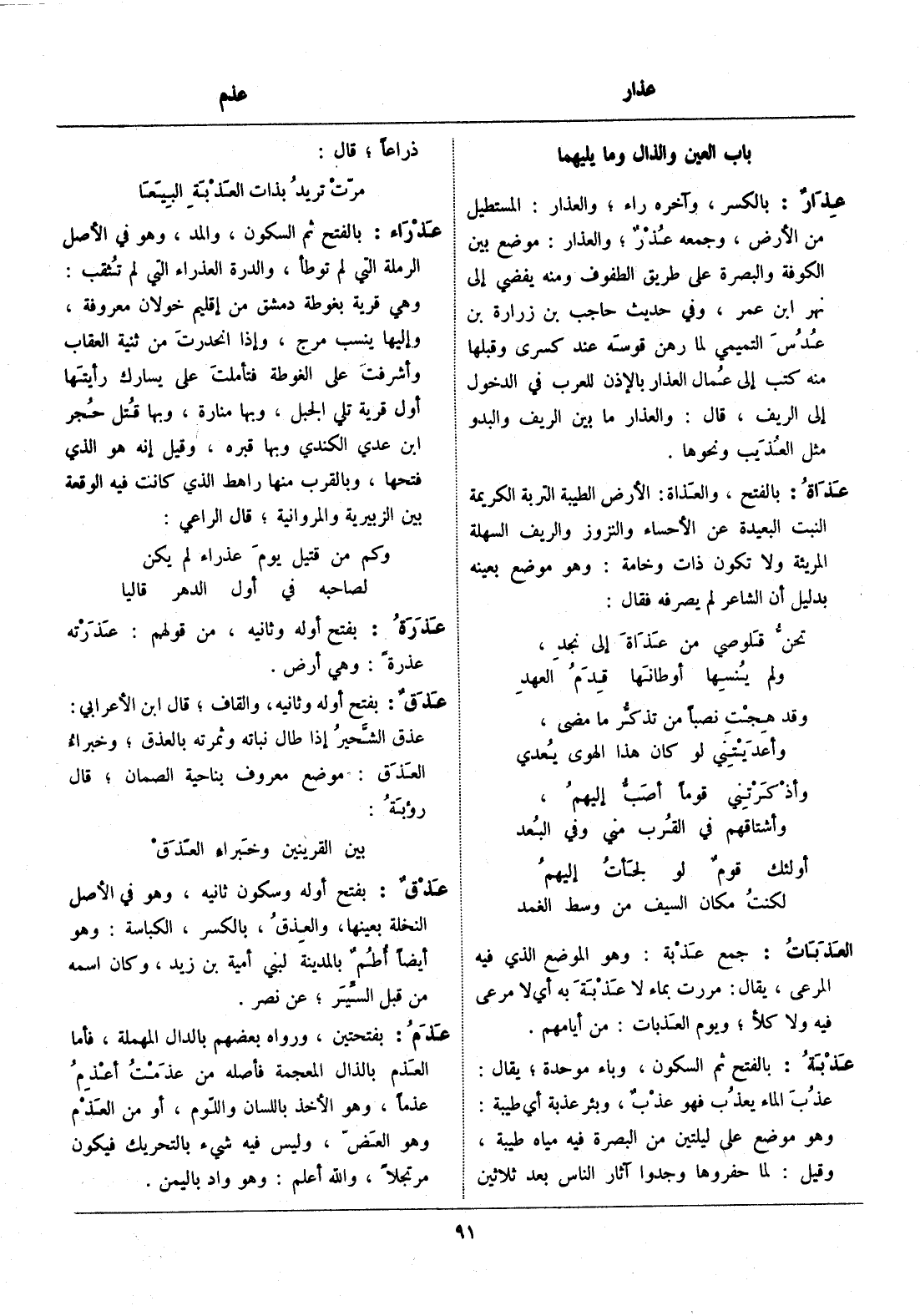 بفتحتين، ورواه بعضهم بالدال المهملة، فأما العذم بالذال المعجمة فأصله من عذمت أعذم عذما، وهو الأخذ باللسان واللّوم، أو من العذم وهو العضّ، وليس فيه شيء بالتحريك فيكون مرتجلا، والله أعلم: وهو واد باليمن.