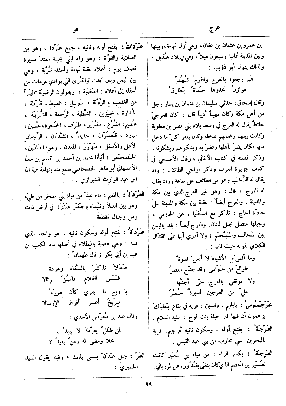 وقال إسحاق: حدثني سليمان بن عثمان بن يسار رجل من أهل مكة وكان مهيبا أديبا قال: كان للعرجيّ حائط يقال له العرج في وسط بلاد بني نصر بن معاوية وكانت إبلهم وغنمهم تدخله وكان يعقر كلّ ما دخل منها فكان يضرّ بأهلها وتضرّ به ويشكوهم ويشكونه، وذكر قصته في كتاب الأغاني، وقال الأصمعي في كتاب جزيرة العرب وذكر نواحي الطائف: واد يقال له النّخب وهو من الطائف على ساعة وواد يقال له العرج، قال: وهو غير العرج الذي بين مكة والمدينة. والعرج أيضا: عقبة بين مكة والمدينة على جادّة الحاج، تذكر مع السّقيا، عن الحازمي، وجبلها متصل بجبل لبنان. والعرج أيضا: بلد باليمن بين المحالب والمهجم، ولا أدري أيها عنى القتّال الكلابي بقوله حيث قال: