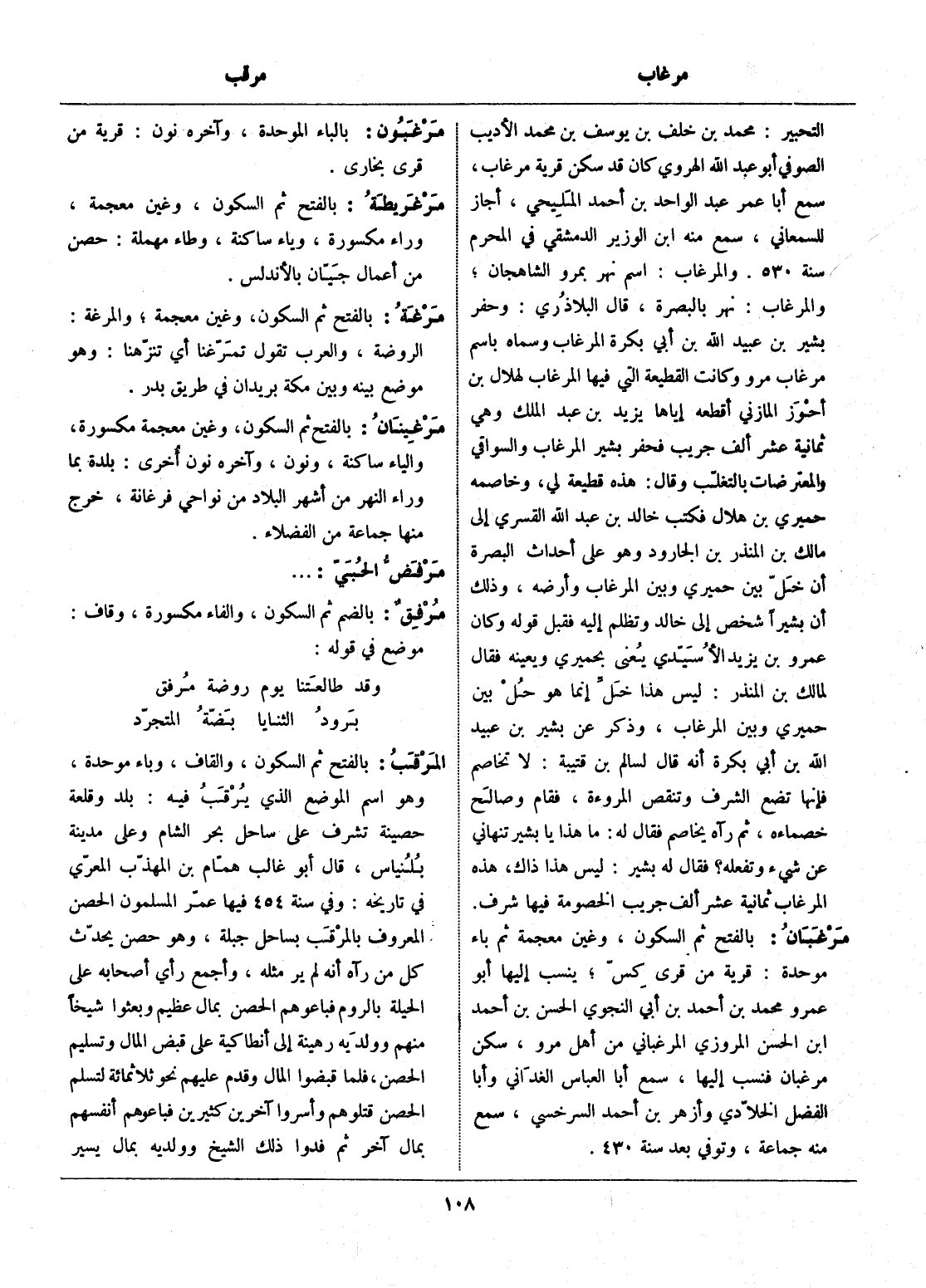 التحبير: محمد بن خلف بن يوسف بن محمد الأديب الصوفي أبو عبد الله الهروي كان قد سكن قرية مرغاب، سمع أبا عمر عبد الواحد بن أحمد المليحي، أجاز للسمعاني، سمع منه ابن الوزير الدمشقي في المحرم سنة 530. والمرغاب: اسم نهر بمرو الشاهجان، والمرغاب: نهر بالبصرة، قال البلاذري: وحفر بشير بن عبيد الله بن أبي بكرة المرغاب وسماه باسم مرغاب مرو وكانت القطيعة التي فيها المرغاب لهلال بن أحوز المازني أقطعه إياها يزيد بن عبد الملك وهي ثمانية عشر ألف جريب فحفر بشير المرغاب والسواقي والمعترضات بالتغلّب وقال: هذه قطيعة لي، وخاصمه حميري بن هلال فكتب خالد بن عبد الله القسري إلى مالك بن المنذر بن الجارود وهو على أحداث البصرة أن خلّ بين حميري وبين المرغاب وأرضه، وذلك أن بشيرا شخص إلى خالد وتظلم إليه فقبل قوله وكان عمرو بن يزيد الأسيّدي يعنى بحميري ويعينه فقال لمالك بن المنذر: ليس هذا خلّ إنما هو حل بين حميري وبين المرغاب، وذكر عن بشير بن عبيد الله بن أبي بكرة أنه قال لسالم بن قتيبة: لا تخاصم فإنها تضع الشرف وتنقص المروءة، فقام وصالح خصماءه، ثم رآه يخاصم فقال له: ما هذا يا بشير تنهاني عن شيء وتفعله؟ فقال له بشير: ليس هذا ذاك، هذه المرغاب ثمانية عشر ألف جريب الخصومة فيها شرف.