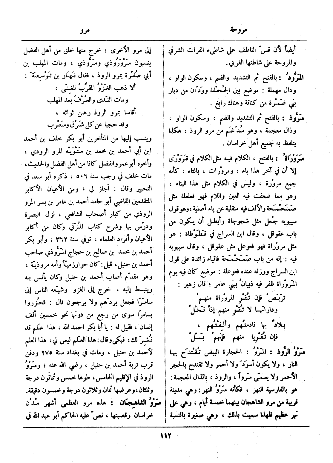 هو بالفارسية النهر، فكأنه مرو النهر: وهي مدينة قريبة من مرو الشاهجان بينهما خمسة أيام، وهي على نهر عظيم فلهذا سميت بذلك، وهي صغيرة بالنسبة إلى مرو الأخرى، خرج منها خلق من أهل الفضل ينسبون مروروذي ومرّوذي، ومات المهلب بر أبي صفرة بمرو الروذ، فقال نهار بن توسعة: