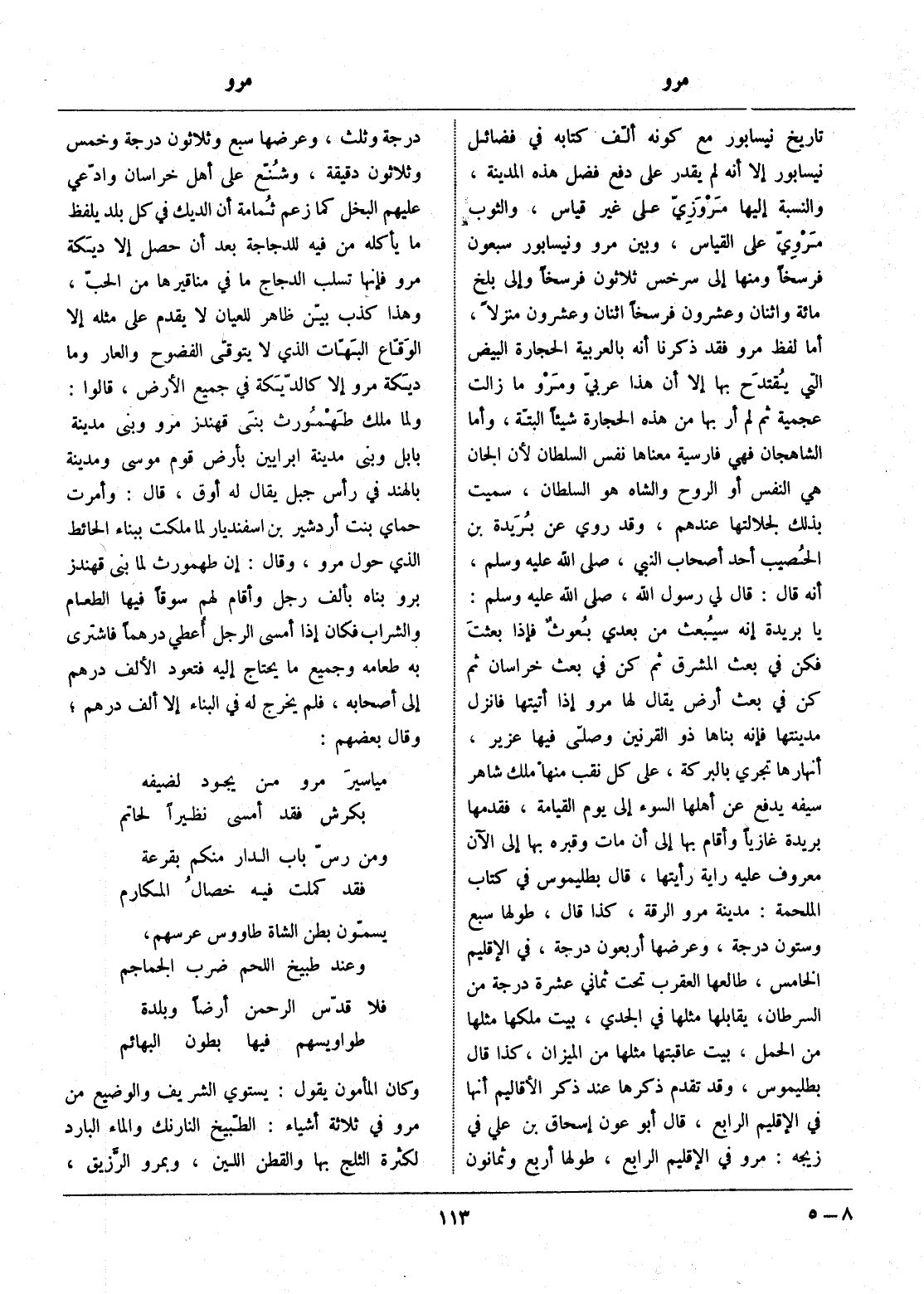 تاريخ نيسابور مع كونه ألّف كتابه في فضائل نيسابور إلا أنه لم يقدر على دفع فضل هذه المدينة، والنسبة إليها مروزيّ على غير قياس، والثوب مرويّ على القياس، وبين مرو ونيسابور سبعون فرسخا ومنها إلى سرخس ثلاثون فرسخا وإلى بلخ مائة واثنان وعشرون فرسخا اثنان وعشرون منزلا، أما لفظ مرو فقد ذكرنا أنه بالعربية الحجارة البيض التي يقتدح بها إلا أن هذا عربيّ ومرو ما زالت عجمية ثم لم أر بها من هذه الحجارة شيئا البتّة، وأما الشاهجان فهي فارسية معناها نفس السلطان لأن الجان هي النفس أو الروح والشاه هو السلطان، سميت بذلك لجلالتها عندهم، وقد روي عن بريدة بن الحصيب أحد أصحاب النبي، صلّى الله عليه وسلّم، أنه قال: قال لي رسول الله، صلّى الله عليه وسلّم: