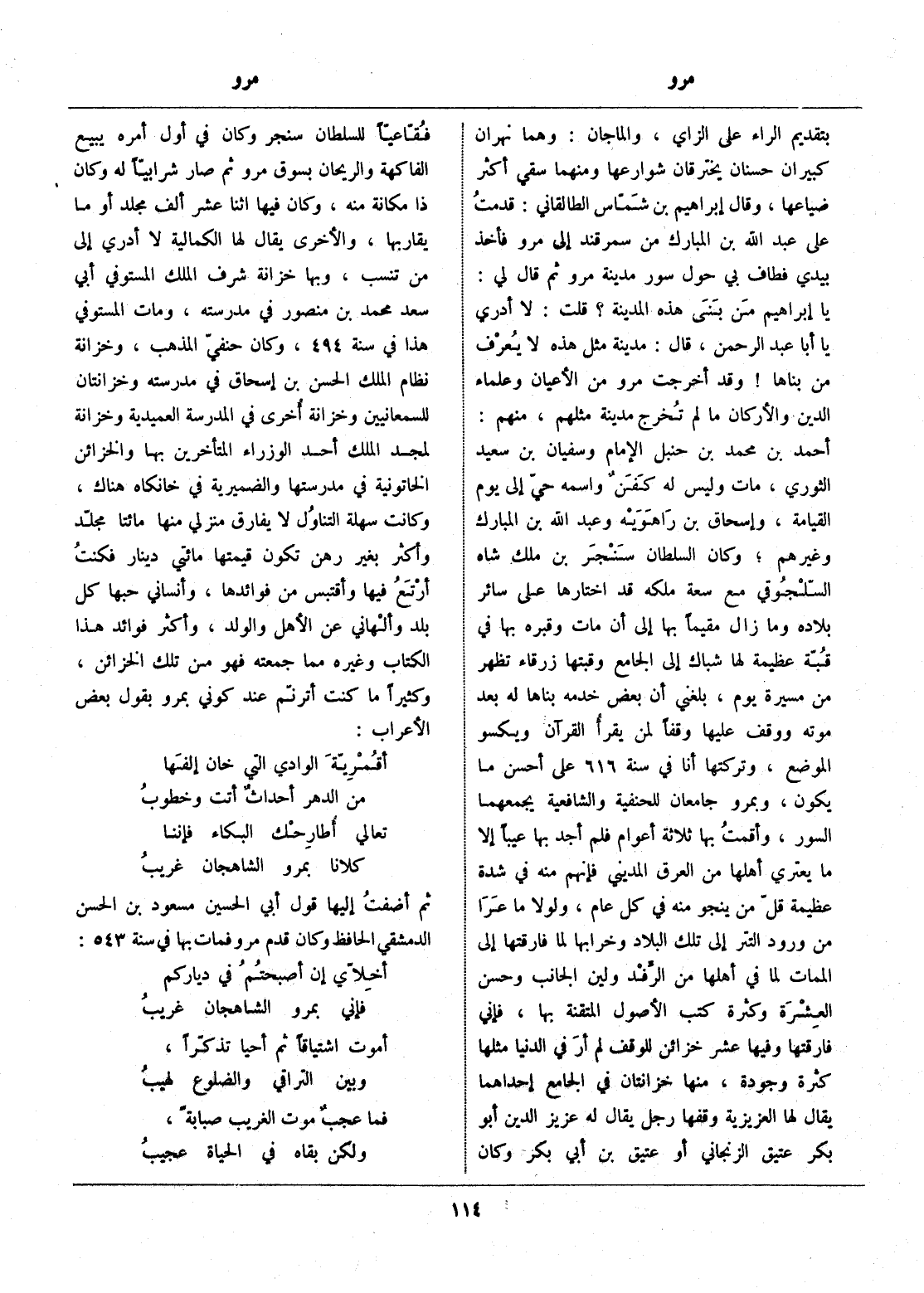 أحمد بن محمد بن حنبل الإمام وسفيان بن سعيد الثوري، مات وليس له كفن واسمه حيّ إلى يوم القيامة، وإسحاق بن راهويه وعبد الله بن المبارك وغيرهم، وكان السلطان سنجر بن ملك شاه السّلجوقي مع سعة ملكه قد اختارها على سائر بلاده وما زال مقيما بها إلى أن مات وقبره بها في قبّة عظيمة لها شباك إلى الجامع وقبتها زرقاء تظهر من مسيرة يوم، بلغني أن بعض خدمه بناها له بعد موته ووقف عليها وقفا لمن يقرأ القرآن ويكسو الموضع، وتركتها أنا في سنة 616 على أحسن ما يكون، وبمرو جامعان للحنفية والشافعية يجمعهما السور، وأقمت بها ثلاثة أعوام فلم أجد بها عيبا إلا ما يعتري أهلها من العرق المديني فإنهم منه في شدة عظيمة قلّ من ينجو منه في كل عام، ولولا ما عرا من ورود التتر إلى تلك البلاد وخرابها لما فارقتها إلى الممات لما في أهلها من الرّفد ولين الجانب وحسن العشرة وكثرة كتب الأصول المتقنة بها، فإني فارقتها وفيها عشر خزائن للوقف لم أر في الدنيا مثلها كثرة وجودة، منها خزانتان في الجامع إحداهما يقال لها العزيزية وقفها رجل يقال له عزيز الدين أبو بكر عتيق الزنجاني أو عتيق بن أبي بكر وكان فقّاعيّا للسلطان سنجر وكان في أول أمره يبيع الفاكهة والريحان بسوق مرو ثم صار شرابيّا له وكان ذا مكانة منه، وكان فيها اثنا عشر ألف مجلد أو ما يقاربها، والأخرى يقال لها الكمالية لا أدري إلى من تنسب، وبها خزانة شرف الملك المستوفي أبي سعد محمد بن منصور في مدرسته، ومات المستوفي هذا في سنة 494، وكان حنفيّ المذهب، وخزانة نظام الملك الحسن بن إسحاق في مدرسته وخزانتان للسمعانيين وخزانة أخرى في المدرسة العميدية وخزانة لمجد الملك أحد الوزراء المتأخرين بها والخزائن الخاتونية في مدرستها والضميرية في خانكاه هناك، وكانت سهلة التناول لا يفارق منزلي منها مائتا مجلّد وأكثر بغير رهن تكون قيمتها مائتي دينار فكنت أرتع فيها وأقتبس من فوائدها، وأنساني حبها كل بلد وألهاني عن الأهل والولد، وأكثر فوائد هذا الكتاب وغيره مما جمعته فهو من تلك الخزائن، وكثيرا ما كنت أترنّم عند كوني بمرو بقول بعض الأعراب: