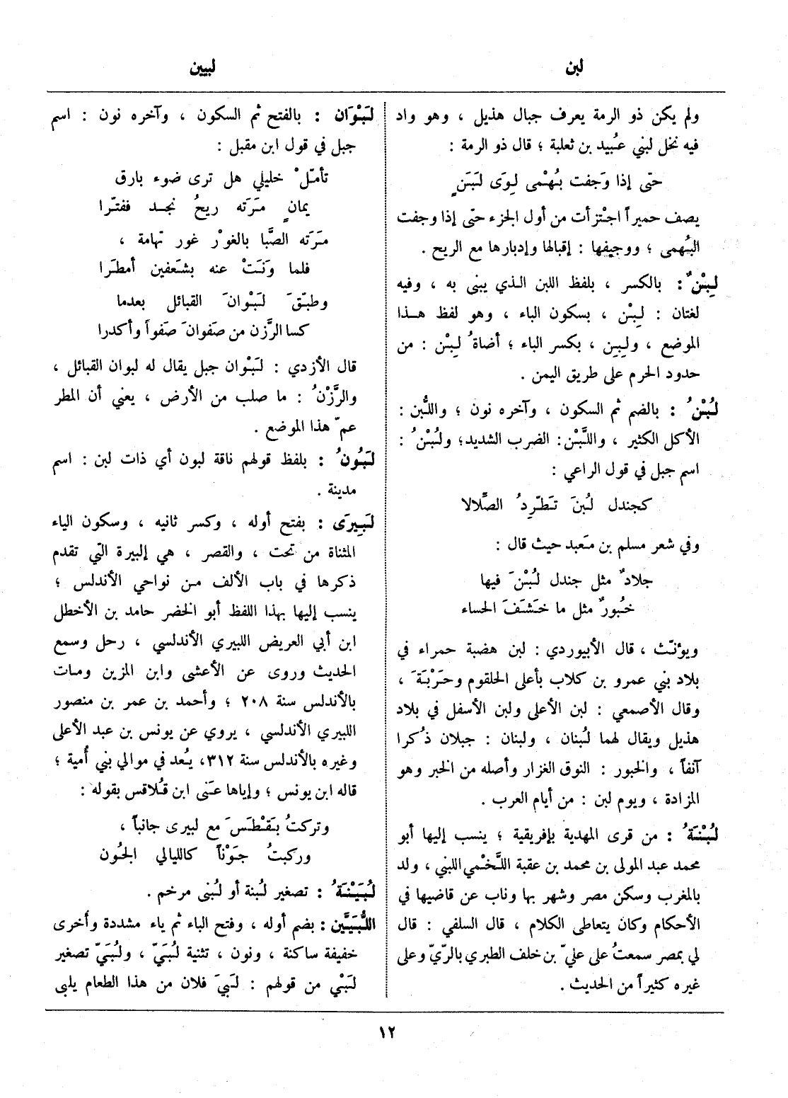 ويؤنّث، قال الأبيوردي: لبن هضبة حمراء في بلاد بني عمرو بن كلاب بأعلى الحلقوم وحربة، وقال الأصمعي: لبن الأعلى ولبن الأسفل في بلاد هذيل ويقال لهما لبنان، ولبنان: جبلان ذكرا آنفا، والخبور: النوق الغزار وأصله من الخبر وهو المزادة، ويوم لبن: من أيام العرب.