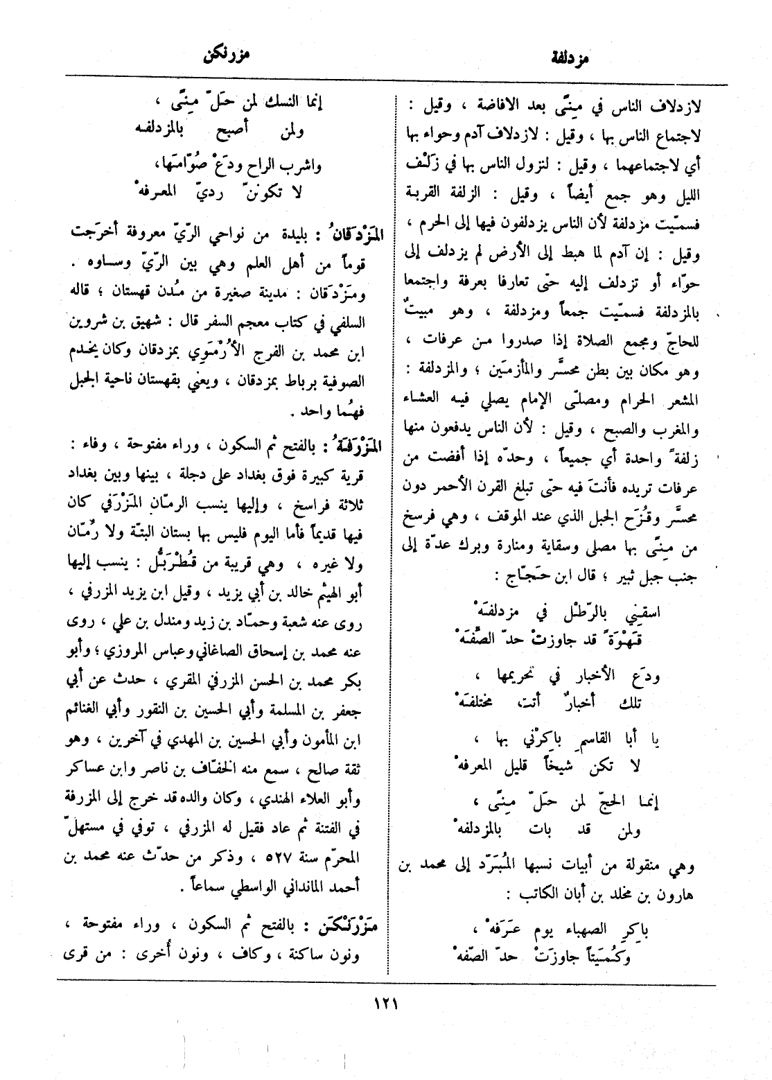 المشعر الحرام ومصلّى الإمام يصلي فيه العشاء والمغرب والصبح، وقيل: لأن الناس يدفعون منها زلفة واحدة أي جميعا، وحدّه إذا أفضت من عرفات تريده فأنت فيه حتى تبلغ القرن الأحمر دون محسّر وقزح الجبل الذي عند الموقف، وهي فرسخ من منى بها مصلى وسقاية ومنارة وبرك عدّة إلى جنب جبل ثبير، قال ابن حجّاج: