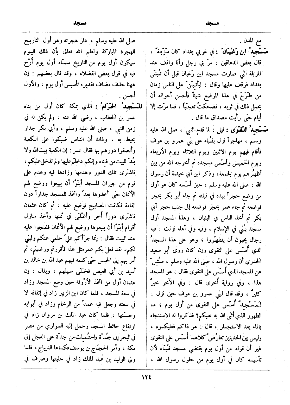 لمسجد أسّس على التقوى من أول يوم، ما الطهور الذي أثنى الله به عليكم؟ فذكروا له الاستنجاء بالماء بعد الاستجمار، قال: هو ذاكم فعليكموه، وليس بين الحديثين تعارض كلاهما أسّس على التقوى غير أن قوله من أول يوم يقتضي مسجد قباء لأن تأسيسه كان في أول يوم من حلول رسول الله، صلّى الله عليه وسلّم، دار هجرته وهو أول التاريخ للهجرة المباركة ولعلم الله تعالى بأن ذلك اليوم سيكون أول يوم من التاريخ سمّاه أول يوم أرّخ فيه في قول بعض الفضلاء، وقد قال بعضهم: إن ههنا حذف مضاف تقديره تأسيس أول يوم، والأول أحسن.