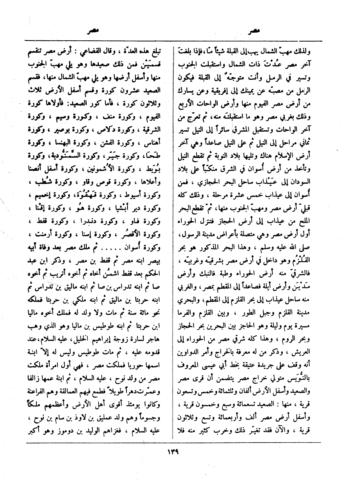 ولذلك مهبّ الشمال يهب إلى القبلة شيئا مّا، فإذا بلغت آخر مصر عدت ذات الشمال واستقبلت الجنوب وتسير في الرمل وأنت متوجّه إلى القبلة فيكون الرمل من مصبّه عن يمينك إلى إفريقية وعن يسارك من أرض مصر الفيوم منها وأرض الواحات الأربع وذلك بغربي مصر وهو ما استقبلته منه، ثم تعرّج من آخر الواحات وتستقبل المشرق سائرا إلى النيل تسير ثماني مراحل إلى النيل ثم على النيل صاعدا وهي آخر أرض الإسلام هناك وتليها بلاد النوبة ثم تقطع النيل وتأخذ من أرض أسوان في الشرق منكّبا على بلاد السودان إلى عيذاب ساحل البحر الحجازي، فمن أسوان إلى عيذاب خمس عشرة مرحلة، وذلك كله قبليّ أرض مصر ومهبّ الجنوب منها، ثمّ تقطع البحر الملح من عيذاب إلى أرض الحجاز فتنزل الحوراء أول أرض مصر وهي متصلة بأعراض مدينة الرسول، صلّى الله عليه وسلّم، وهذا البحر المذكور هو بحر القلزم وهو داخل في أرض مصر بشرقيّه وغربيّه، فالشرقيّ منه أرض الحوراء وطبة فالنبك وأرض مدين وأرض أيلة فصاعدا إلى المقطم بمصر، والغربي منه ساحل عيذاب إلى بحر القلزم إلى المقطم، والبحري مدينة القلزم وجبل الطور، وبين القلزم والفرما مسيرة يوم وليلة وهو الحاجز بين البحرين بحر الحجاز وبحر الروم، وهذا كله شرقي مصر من الحوراء إلى العريش، وذكر من له معرفة بالخراج وأمر الدواوين أنه وقف على جريدة عتيقة بخط أبي عيسى المعروف بالنّويس متولي خراج مصر يتضمن أن قرى مصر والصعيد وأسفل الأرض ألفان وثلاثمائة وخمس وتسعون قرية، منها: الصعيد تسعمائة وسبع وخمسون قرية، وأسفل أرض مصر ألف وأربعمائة وتسع وثلاثون قرية، والآن فقد تغيّر ذلك وخرب كثير منه فلا تبلغ هذه العدّة، وقال القضاعي: أرض مصر تنقسم قسمين فمن ذلك صعيدها وهو يلي مهبّ الجنوب منها وأسفل أرضها وهو يليّ مهبّ الشمال منها، فقسم الصعيد عشرون كورة وقسم أسفل الأرض ثلاث وثلاثون كورة، فأما كور الصعيد: فأولاها كورة الفيوم، وكورة منف، وكورة وسيم، وكورة الشرقية، وكورة دلاص، وكورة بوصير، وكورة أهناس، وكورة الفشن، وكورة البهنسا، وكورة طحا، وكورة جيّر، وكورة السّمنّودية، وكورة بويط، وكورة الأشمونين، وكورة أسفل أنصنا وأعلاها، وكورة قوص وقاو، وكورة شطب، وكورة أسيوط، وكورة قهقوه، وكورة إخميم، وكورة دير أبشيا، وكورة هو، وكورة إقنا، وكورة فاو، وكورة دندرا، وكورة قفط، وكورة الأقصر، وكورة إسنا، وكورة أرمنت، وكورة أسوان ... ثم ملك مصر بعد وفاة أبيه بيصر ابنه مصر ثم قفط بن مصر، وذكر ابن عبد الحكم بعد قفط اشمن أخاه ثم أخوه أتريب ثم أخوه صا ثم ابنه تدراس بن صا ثم ابنه ماليق بن تدراس ثم ابنه حربتا بن ماليق ثم ابنه ملكي بن حربتا فملكه نحو مائة سنة ثم مات ولا ولد له فملك أخوه ماليا إن حربتا ثم ابنه طوطيس بن ماليا وهو الذي وهب هاجر لسارة زوجة إبراهيم الخليل، عليه السّلام، عند قدومه عليه، ثم مات طوطيس وليس له إلّا ابنة اسمها حوريا فملكت مصر، فهي أول امرأة ملكت مصر من ولد نوح، عليه السّلام، ثم ابنة عمها زالفا وعمّرت دهرا طويلا فطمع فيهم العمالقة وهم الفراعنة وكانوا يومئذ أقوى أهل الأرض وأعظمهم ملكا وجسوما وهم ولد عمليق بن لاوذ بن سام بن نوح، عليه السلام، فغزاهم الوليد بن دوموز وهو أكبر