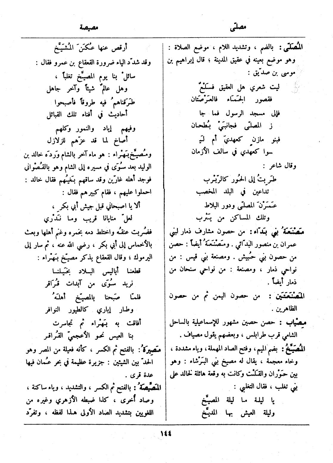 بضم الميم، وفتح الصاد المهملة، وياء مشددة، وخاء معجمة، يقال له مصيخ بني البرشاء: وهو بين حوران والقلت وكانت به وقعة هائلة لخالد على بني تغلب، فقال التغلبي: