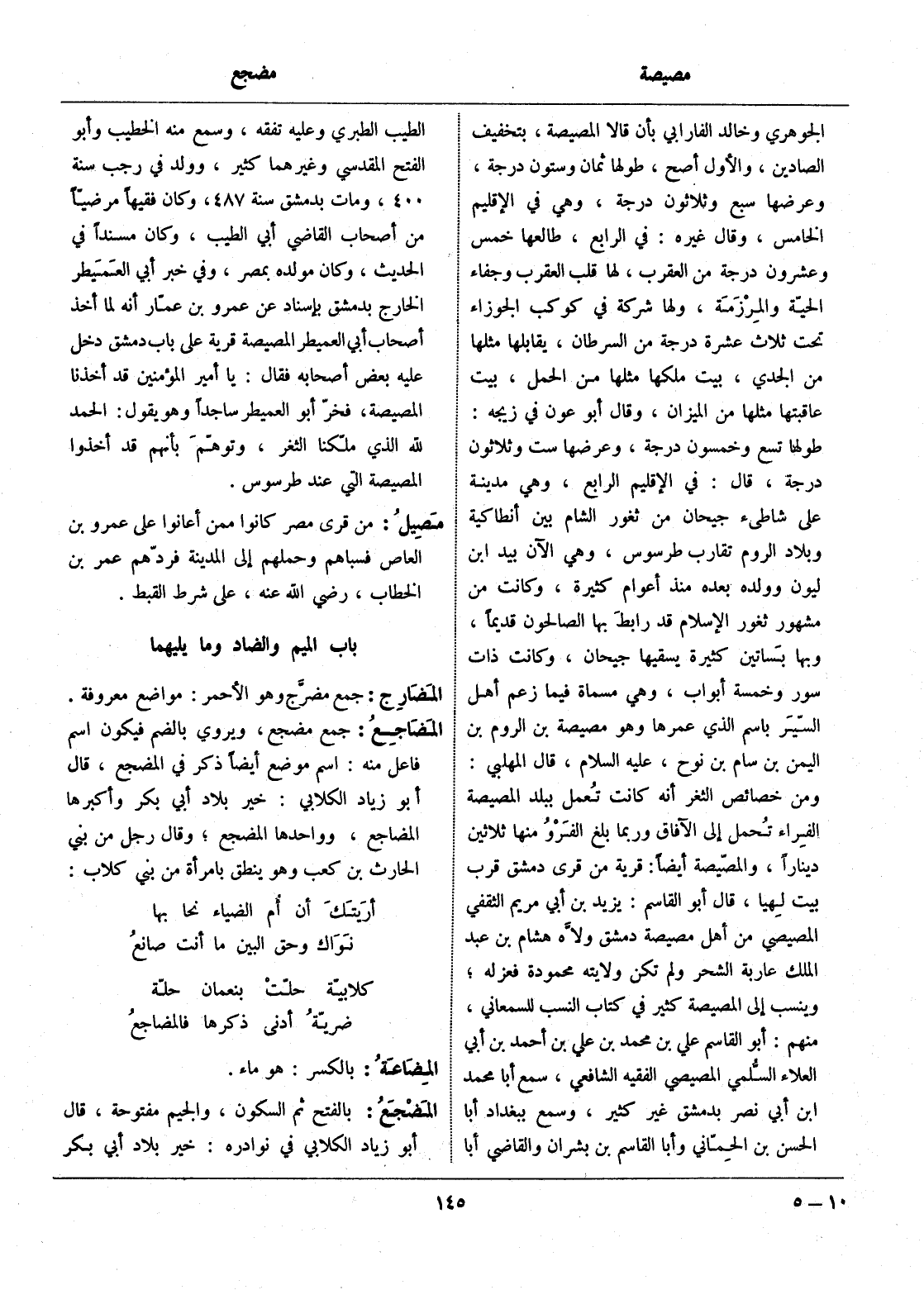 ومن خصائص الثغر أنه كانت تعمل ببلد المصيصة الفراء تحمل إلى الآفاق وربما بلغ الفرو منها ثلاثين دينارا، والمصّيصة أيضا: قرية من قرى دمشق قرب بيت لهيا، قال أبو القاسم: يزيد بن أبي مريم الثقفي المصيصي من أهل مصيصة دمشق ولّاه هشام بن عبد الملك عاربة الشحر ولم تكن ولايته محمودة فعزله، وينسب إلى المصيصة كثير في كتاب النسب للسمعاني، منهم: أبو القاسم علي بن محمد بن علي بن أحمد بن أبي العلاء السّلمي المصيصي الفقيه الشافعي، سمع أبا محمد ابن أبي نصر بدمشق غير كثير، وسمع ببغداد أبا الحسن بن الحمّاني وأبا القاسم بن بشران والقاضي أبا الطيب الطبري وعليه تفقه، وسمع منه الخطيب وأبو الفتح المقدسي وغيرهما كثير، وولد في رجب سنة 400، ومات بدمشق سنة 487، وكان فقيها مرضيّا من أصحاب القاضي أبي الطيب، وكان مسندا في الحديث، وكان مولده بمصر، وفي خبر أبي العميطر الخارج بدمشق بإسناد عن عمرو بن عمّار أنه لما أخذ أصحاب أبي العميطر المصيصة قرية على باب دمشق دخل عليه بعض أصحابه فقال: يا أمير المؤمنين قد أخذنا المصيصة، فخرّ أبو العميطر ساجدا وهو يقول: الحمد لله الذي ملّكنا الثغر، وتوهّم بأنهم قد أخذوا المصيصة التي عند طرسوس.