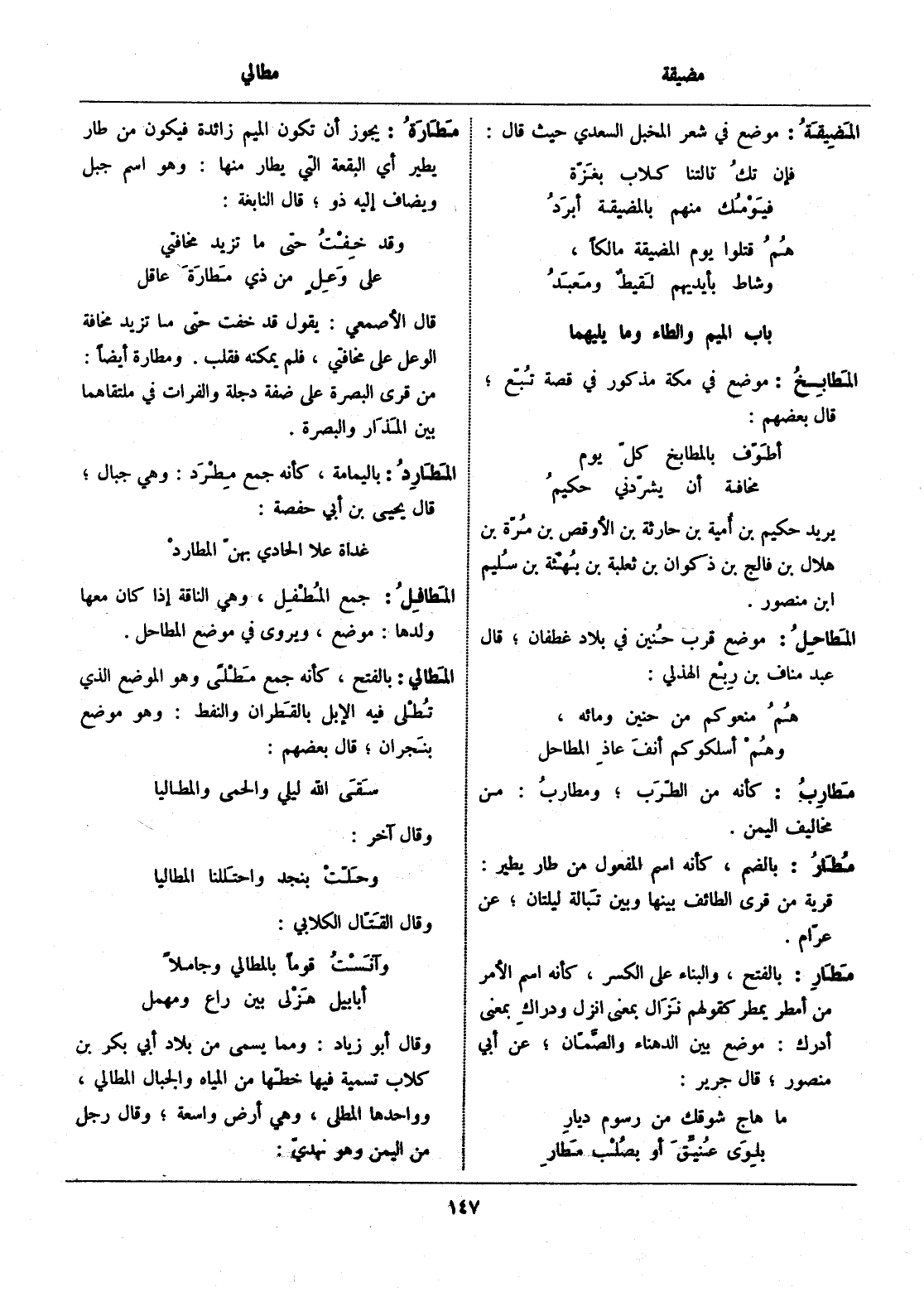 وقال أبو زياد: ومما يسمى من بلاد أبي بكر بن كلاب تسمية فيها خطّها من المياه والجبال المطالي، وواحدها المطلى، وهي أرض واسعة، وقال رجل من اليمن وهو نهديّ: