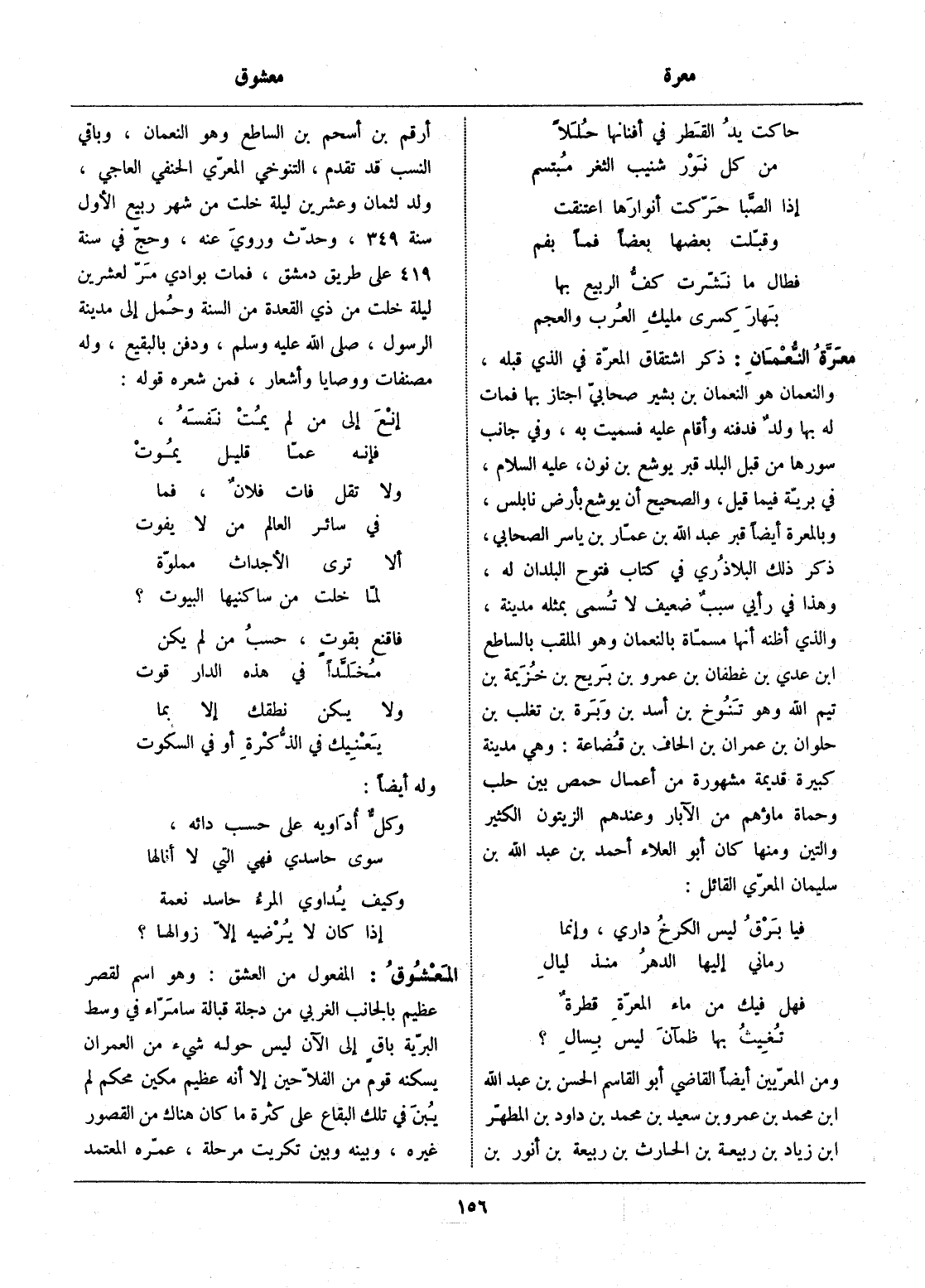 ذكر اشتقاق المعرّة في الذي قبله، والنعمان هو النعمان بن بشير صحابيّ اجتاز بها فمات له بها ولد فدفنه وأقام عليه فسميت به، وفي جانب سورها من قبل البلد قبر يوشع بن نون، عليه السّلام، في بريّة فيما قيل، والصحيح أن يوشع بأرض نابلس، وبالمعرة أيضا قبر عبد الله بن عمّار بن ياسر الصحابي، ذكر ذلك البلاذري في كتاب فتوح البلدان له، وهذا في رأيي سبب ضعيف لا تسمى بمثله مدينة، والذي أظنه أنها مسمّاة بالنعمان وهو الملقب بالساطع ابن عدي بن غطفان بن عمرو بن بريح بن خزيمة بن تيم الله وهو تنوخ بن أسد بن وبرة بن تغلب بن حلوان بن عمران بن الحاف بن قضاعة: وهي مدينة كبيرة قديمة مشهورة من أعمال حمص بين حلب وحماة ماؤهم من الآبار وعندهم الزيتون الكثير والتين ومنها كان أبو العلاء أحمد بن عبد الله بن سليمان المعرّي القائل: