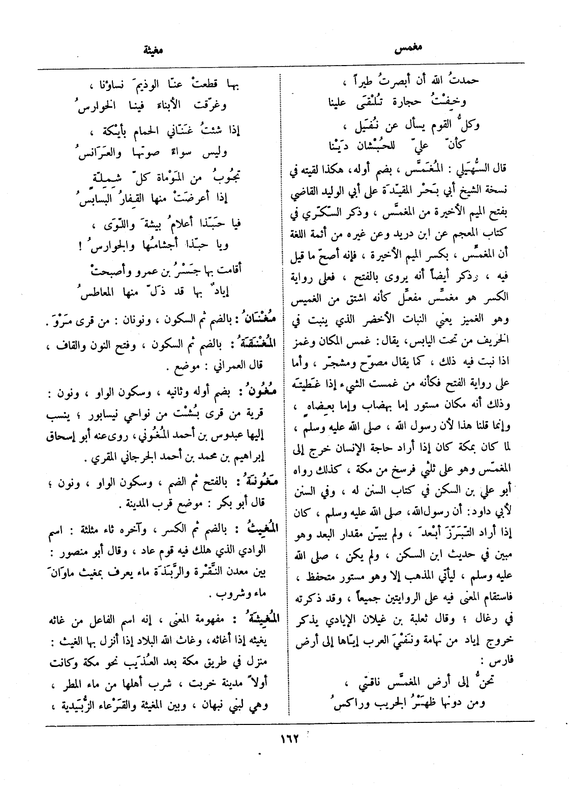 قال السّهيلي: المغمّس، بضم أوله، هكذا لقيته في نسخة الشيخ أبي بحر المقيّدة على أبي الوليد القاضي بفتح الميم الأخيرة من المغمّس، وذكر السّكّري في كتاب المعجم عن ابن دريد وعن غيره من أئمة اللغة أن المغمّس، بكسر الميم الأخيرة، فإنه أصحّ ما قبل فيه، وذكر أيضا أنه يروى بالفتح، فعلى رواية الكسر هو مغمّس مفعّل كأنه اشتق من الغميس وهو الغميز يعني النبات الأخضر الذي ينبت في الخريف من تحت اليابس، يقال: غمس المكان وغمز إذا نبت فيه ذلك، كما يقال مصوّح ومشجّر، وأما على رواية الفتح فكأنه من غمست الشيء إذا غطيته وذلك أنه مكان مستور إما بهضاب وإما بعضاه، وإنما قلنا هذا لأن رسول الله، صلّى الله عليه وسلّم، لما كان بمكة كان إذا أراد حاجة الإنسان خرج إلى المغمّس وهو على ثلثي فرسخ من مكة، كذلك رواه أبو علي بن السكن في كتاب السنن له، وفي السنن لأبي داود: أن رسول الله، صلّى الله عليه وسلّم، كان إذا أراد التّبرّز أبعد، ولم يبيّن مقدار البعد وهو مبين في حديث ابن السكن، ولم يكن، صلّى الله عليه وسلّم، ليأتي المذهب إلا وهو مستور متحفظ، فاستقام المعنى فيه على الروايتين جميعا، وقد ذكرته في رغال، وقال ثعلبة بن غيلان الإيادي يذكر خروج إياد من تهامة ونفي العرب إيّاها إلى أرض فارس: