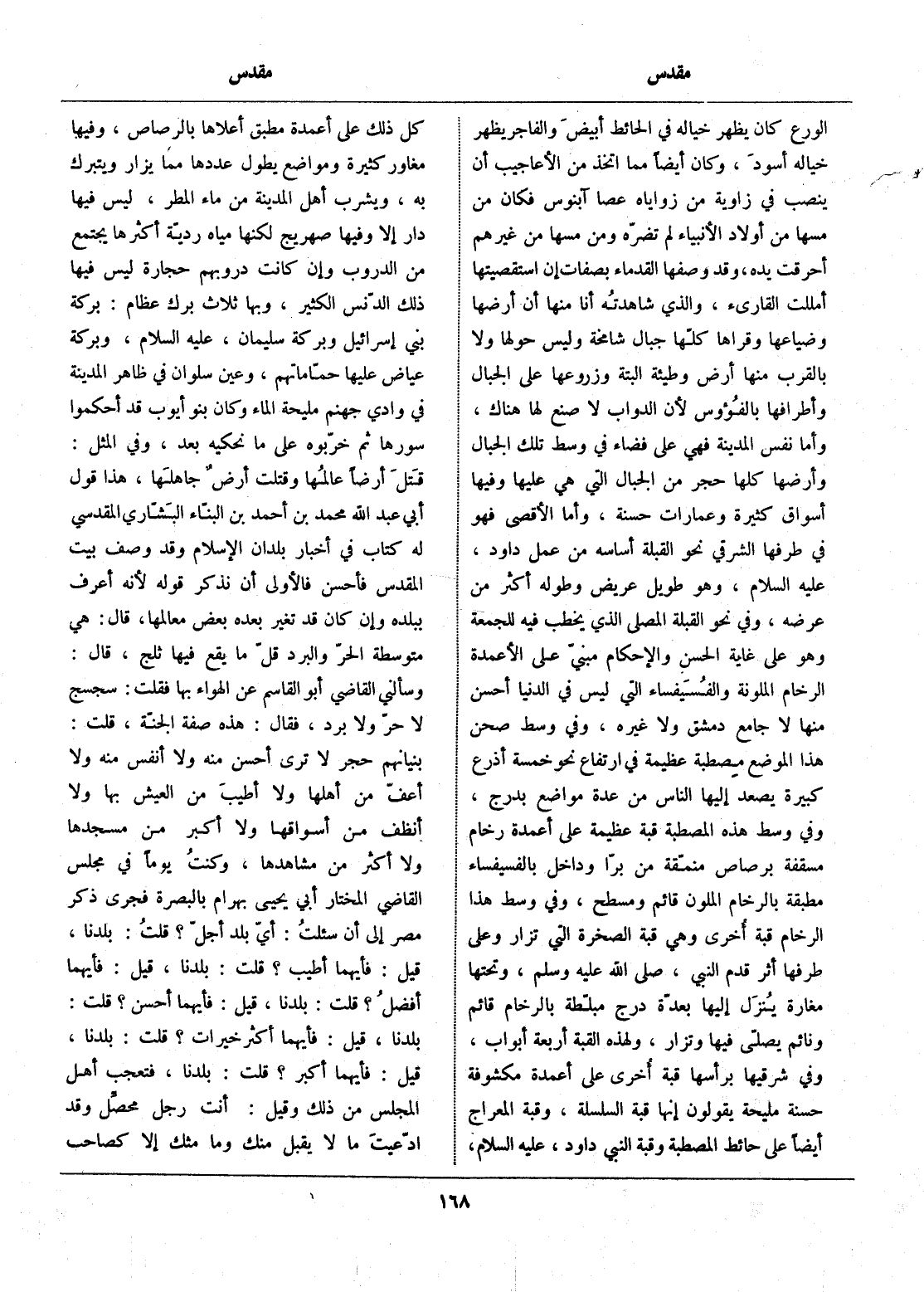 الورع كان يظهر خياله في الحائط أبيض والفاجر يظهر خياله أسود، وكان أيضا مما اتخذ من الأعاجيب أن ينصب في زاوية من زواياه عصا آبنوس فكان من مسها من أولاد الأنبياء لم تضرّه ومن مسها من غيرهم أحرقت يده، وقد وصفها القدماء بصفات إن استقصيتها أمللت القارئ، والذي شاهدته أنا منها أن أرضها وضياعها وقراها كلّها جبال شامخة وليس حولها ولا بالقرب منها أرض وطيئة البتة وزروعها على الجبال وأطرافها بالفؤوس لأن الدواب لا صنع لها هناك، وأما نفس المدينة فهي على فضاء في وسط تلك الجبال وأرضها كلها حجر من الجبال التي هي عليها وفيها أسواق كثيرة وعمارات حسنة، وأما الأقصى فهو في طرفها الشرقي نحو القبلة أساسه من عمل داود، عليه السّلام، وهو طويل عريض وطوله أكثر من عرضه، وفي نحو القبلة المصلى الذي يخطب فيه للجمعة وهو على غاية الحسن والإحكام مبنيّ على الأعمدة الرخام الملونة والفسيفساء التي ليس في الدنيا أحسن منها لا جامع دمشق ولا غيره، وفي وسط صحن هذا الموضع مصطبة عظيمة في ارتفاع نحو خمسة أذرع كبيرة يصعد إليها الناس من عدة مواضع بدرج، وفي وسط هذه المصطبة قبة عظيمة على أعمدة رخام مسقفة برصاص منمّقة من برّا وداخل بالفسيفساء مطبقة بالرخام الملون قائم ومسطح، وفي وسط هذا الرخام قبة أخرى وهي قبة الصخرة التي تزار وعلى طرفها أثر قدم النبي، صلّى الله عليه وسلّم، وتحتها مغارة ينزل إليها بعدّة درج مبلّطة بالرخام قائم ونائم يصلّى فيها وتزار، ولهذه القبة أربعة أبواب، وفي شرقيها برأسها قبة أخرى على أعمدة مكشوفة حسنة مليحة يقولون إنها قبة السلسلة، وقبة المعراج أيضا على حائط المصطبة وقبة النبي داود، عليه السّلام، كل ذلك على أعمدة مطبق أعلاها بالرصاص، وفيها مغاور كثيرة ومواضع يطول عددها مما يزار ويتبرك به، ويشرب أهل المدينة من ماء المطر، ليس فيها دار إلا وفيها صهريج لكنها مياه رديّة أكثرها يجتمع من الدروب وإن كانت دروبهم حجارة ليس فيها ذلك الدّنس الكثير، وبها ثلاث برك عظام: بركة بني إسرائيل وبركة سليمان، عليه السّلام، وبركة عياض عليها حمّاماتهم، وعين سلوان في ظاهر المدينة في وادي جهنم مليحة الماء وكان بنو أيوب قد أحكموا سورها ثم خرّبوه على ما نحكيه بعد، وفي المثل: