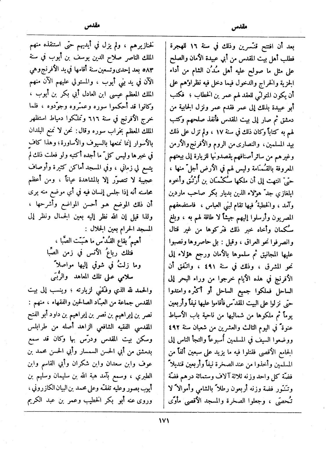 بعد أن افتتح قنّسرين وذلك في سنة 16 للهجرة فطلب أهل بيت المقدس من أبي عبيدة الأمان والصلح على مثل ما صولح عليه أهل مدن الشام من أداء الجزية والخراج والدخول فيما دخل فيه نظراؤهم على أن يكون المتولّي للعقد لهم عمر بن الخطاب، فكتب أبو عبيدة بذلك إلى عمر فقدم عمر ونزل الجابية من دمشق ثم صار إلى بيت المقدس فأنفذ صلحهم وكتب لهم به كتابا وكان ذلك في سنة 17، ولم تزل على ذلك بيد المسلمين، والنصارى من الروم والأفرنج والأرمن وغيرهم من سائر أصنافهم يقصدونها للزيارة إلى بيعتهم المعروفة بالقمامة وليس لهم في الأرض أجلّ منها، حتى انتهت إلى أن ملكها سكمان بن أرتق وأخوه ايلغازي جدّ هؤلاء الذين بدياربكر صاحب ماردين وآمد، والخطبة فيها تقام لبني العباس، فاستضعفهم المصريون وأرسلوا إليهم جيشا لا طاقة لهم به، وبلغ سكمان وأخاه خبر ذلك فتركوها من غير قتال وانصرفوا نحو العراق، وقيل: بل حاصروها ونصبوا عليها المجانيق ثم سلموها بالأمان ورجع هؤلاء إلى نحو المشرق، وذلك في سنة 491، واتّفق أن الأفرنج في هذه الأيام خرجوا من وراء البحر إلى الساحل فملكوا جميع الساحل أو أكثره وامتدوا حتى نزلوا على البيت المقدّس فأقاموا عليها نيفا وأربعين يوما ثم ملكوها من شماليها من ناحية باب الأسباط عنوة في اليوم الثالث والعشرين من شعبان سنة 492 ووضعوا السيف في المسلمين أسبوعا والتجأ الناس إلى الجامع الأقصى فقتلوا فيه ما يزيد على سبعين ألفا من المسلمين وأخذوا من عند الصخرة نيفا وأربعين قنديلا فضّة كل واحد وزنه ثلاثة آلاف وستمائة درهم فضّة وتنّور فضة وزنه أربعون رطلا بالشامي وأموالا لا تحصى، وجعلوا الصخرة والمسجد الأقصى مأوى لخنازيرهم، ولم يزل في أيديهم حتى استنقذه منهم الملك الناصر صلاح الدين يوسف بن أيوب في سنة 583 بعد إحدى وتسعين سنة أقامها في يد الأفرنج وهي الآن في يد بني أيوب، والمستولي عليهم الآن منهم الملك المعظم عيسى ابن العادل أبي بكر بن أيوب، وكانوا قد أحكموا سوره وعمّروه وجوّدوه، فلما خرج الأفرنج في سنة 616 وتملّكوا دمياط استظهر الملك المعظم بخراب سوره وقال: نحن لا نمنع البلدان بالأسوار إنما نمنعها بالسيوف والأساورة، وهذا كاف في خبرها وليس كلّ ما أجده أكتبه ولو فعلت ذلك لم يتسع لي زماني، وفي المسجد أماكن كثيرة وأوصاف عجيبة لا تتصوّر إلا بالمشاهدة عيانا، ومن أعظم محاسنه أنه إذا جلس إنسان فيه في أي موضع منه يرى أن ذلك الموضع هو أحسن المواضع وأشرحها، ولذا قيل إن الله نظر إليه بعين الجمال ونظر إلى المسجد الحرام بعين الجلال: