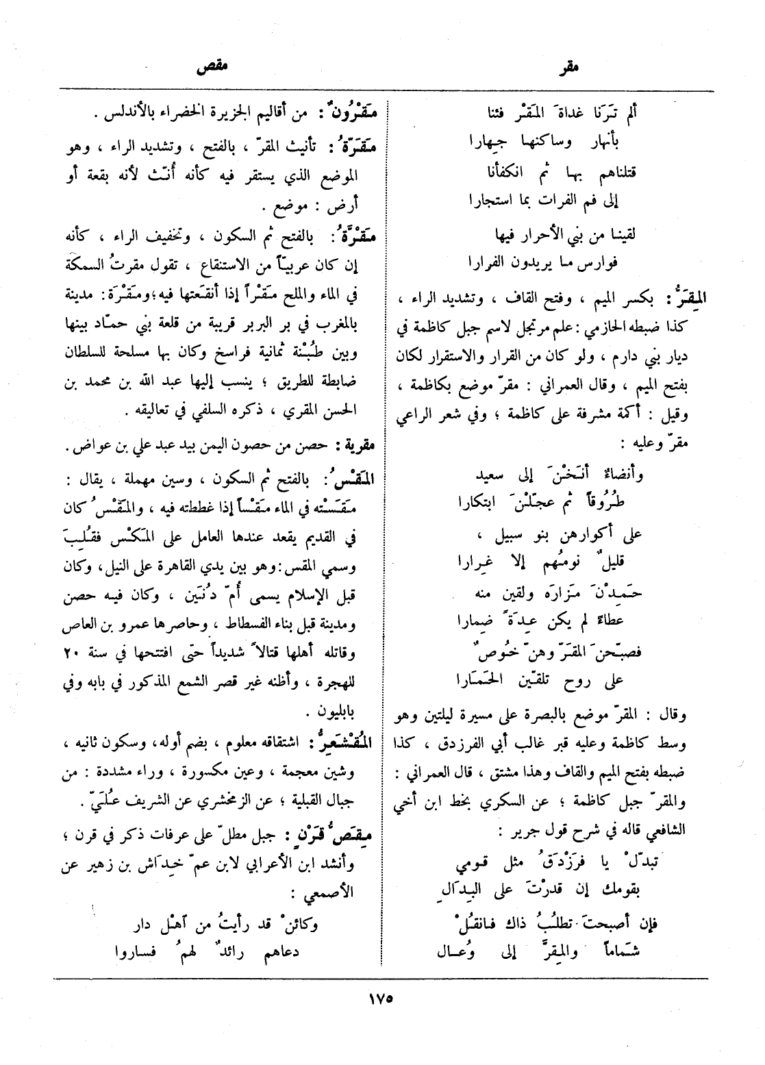 وقال: المقرّ موضع بالبصرة على مسيرة ليلتين وهو وسط كاظمة وعليه قبر غالب أبي الفرزدق، كذا ضبطه بفتح الميم والقاف وهذا مشتق، قال العمراني: