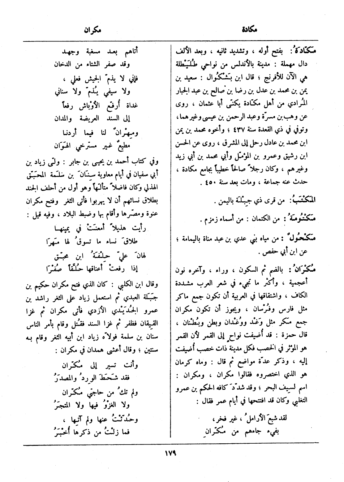 بالضم ثم السكون، وراء، وآخره نون أعجمية، وأكثر ما تجيء في شعر العرب مشددة الكاف، واشتقاقها في العربية أن تكون جمع ما كر مثل فارس وفرسان، ويجوز أن تكون مكران جمع مكر مثل وغد ووغدان وبطن وبطنان، قال حمزة: قد أضيفت نواح إلى القمر لأن القمر هو المؤثر في الخصب فكل مدينة ذات خصب أضيفت إليه، وذكر عدّة مواضع ثم قال: وماه كرمان هو الذي اختصروه فقالوا مكران، ومكران: