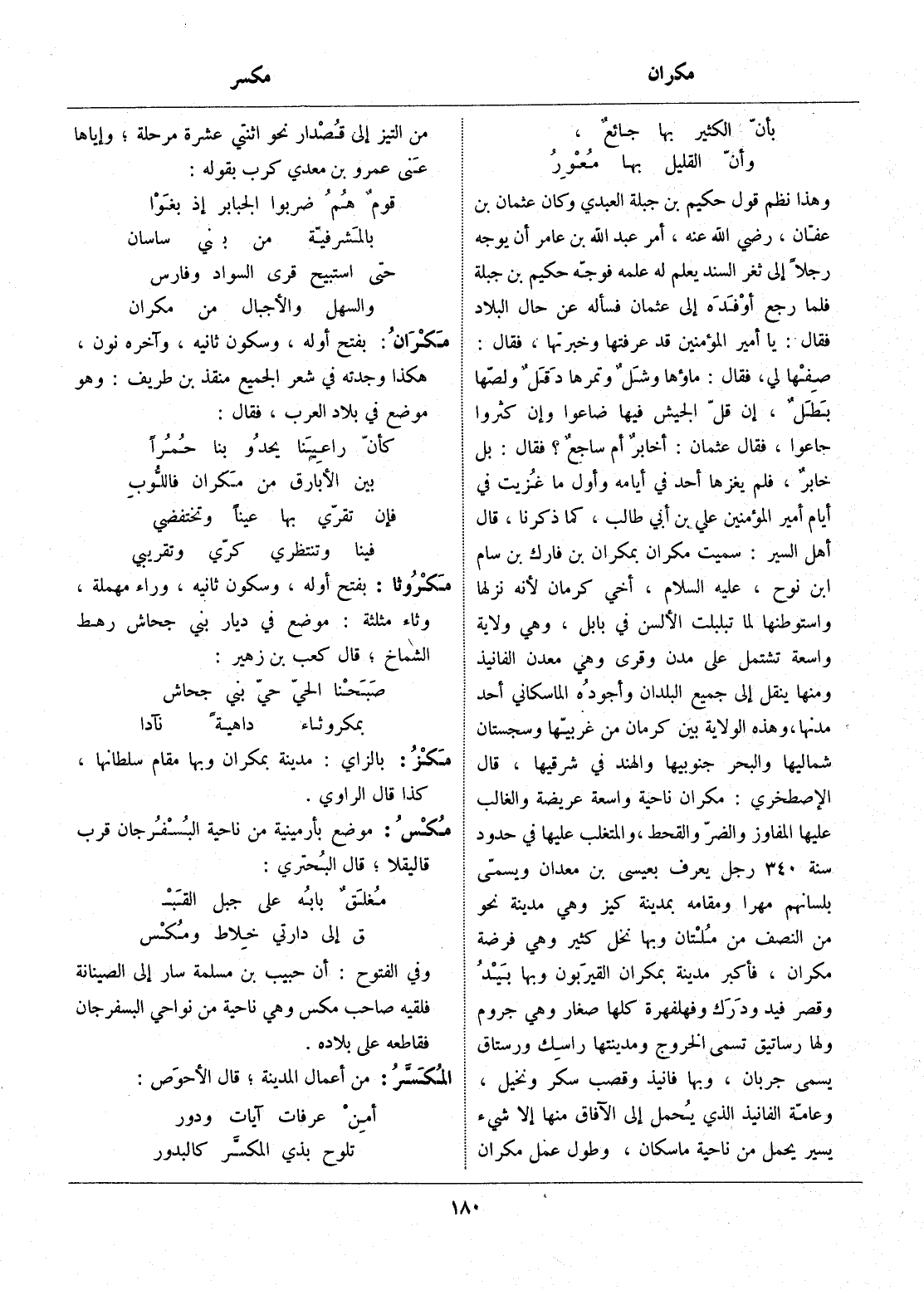 صفها لي، فقال: ماؤها وشل وتمرها دقل ولصّها بطل، إن قلّ الجيش فيها ضاعوا وإن كثروا جاعوا، فقال عثمان: أخابر أم ساجع؟ فقال: بل خابر، فلم يغزها أحد في أيامه وأول ما غزيت في أيام أمير المؤمنين علي بن أبي طالب، كما ذكرنا، قال أهل السير: سميت مكران بمكران بن فارك بن سام ابن نوح، عليه السّلام، أخي كرمان لأنه نزلها واستوطنها لما تبلبلت الألسن في بابل، وهي ولاية واسعة تشتمل على مدن وقرى وهي معدن الفانيذ ومنها ينقل إلى جميع البلدان وأجوده الماسكاني أحد مدنها، وهذه الولاية بين كرمان من غربيّها وسجستان شماليها والبحر جنوبيها والهند في شرقيها، قال الإصطخري: مكران ناحية واسعة عريضة والغالب عليها المفاوز والضرّ والقحط، والمتغلب عليها في حدود سنة 340 رجل يعرف بعيسى بن معدان ويسمّى بلسانهم مهرا ومقامه بمدينة كيز وهي مدينة نحو من النصف من ملتان وبها نخل كثير وهي فرضة مكران، فأكبر مدينة بمكران القيربون وبها بيد وقصر فيد ودرك وفهلفهرة كلها صغار وهي جروم ولها رساتيق تسمى الخروج ومدينتها رأسك ورستاق يسمى جربان، وبها فانيذ وقصب سكر ونخيل، وعامّة الفانيذ الذي يحمل إلى الآفاق منها إلا شيء يسير يحمل من ناحية ماسكان، وطول عمل مكران من التيز إلى قصدار نحو اثنتي عشرة مرحلة، وإياها عنى عمرو بن معدي كرب بقوله: