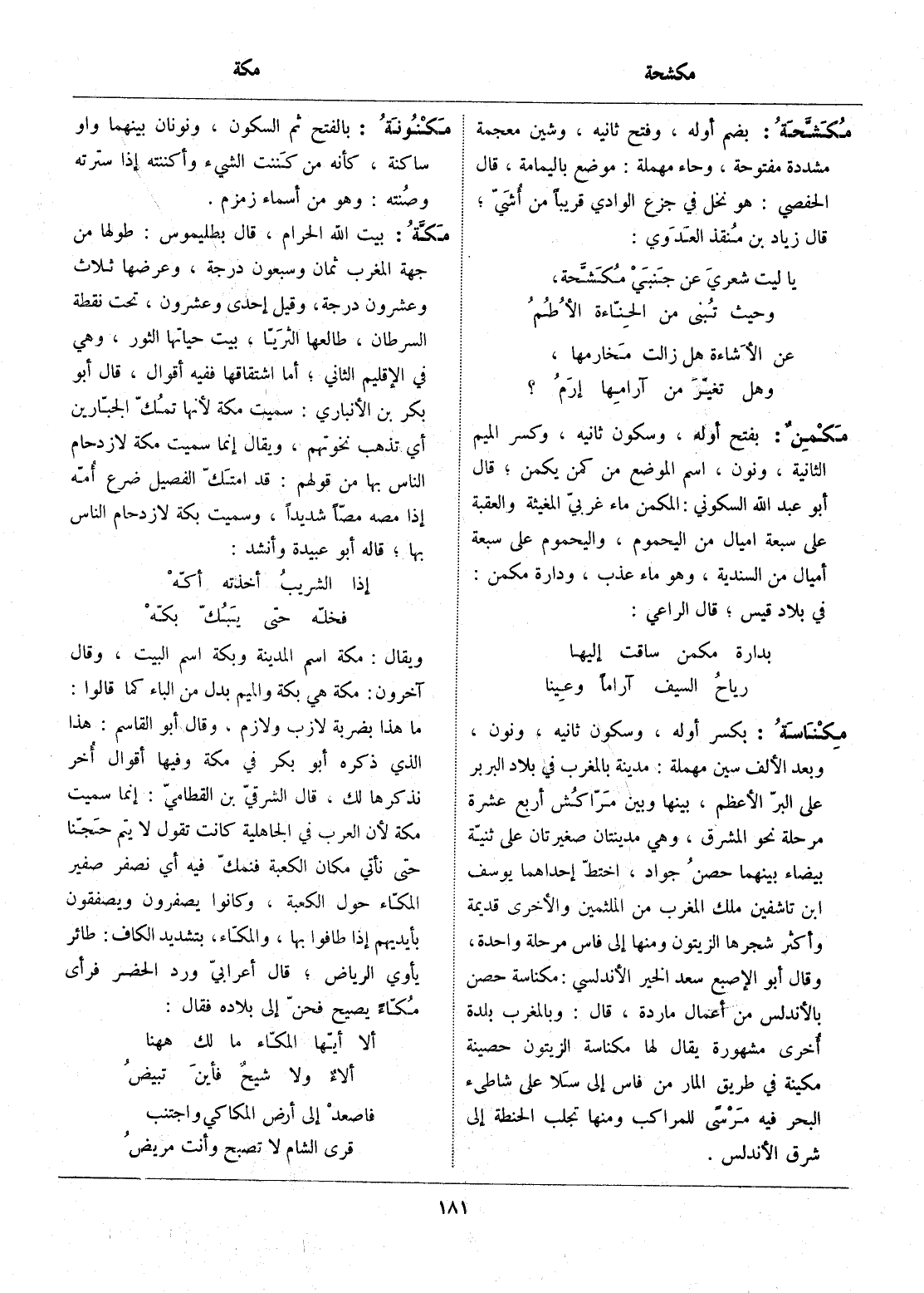 بيت الله الحرام، قال بطليموس: طولها من جهة المغرب ثمان وسبعون درجة، وعرضها ثلاث وعشرون درجة، وقيل إحدى وعشرون، تحت نقطة السرطان، طالعها الثريّا، بيت حياتها الثور، وهي في الإقليم الثاني، أما اشتقاقها ففيه أقوال، قال أبو بكر بن الأنباري: سميت مكة لأنها تمكّ الجبّارين أي تذهب نخوتهم، ويقال إنما سميت مكة لازدحام الناس بها من قولهم: قد امتكّ الفصيل ضرع أمّه إذا مصه مصّا شديدا، وسميت بكة لازدحام الناس بها، قاله أبو عبيدة وأنشد:
