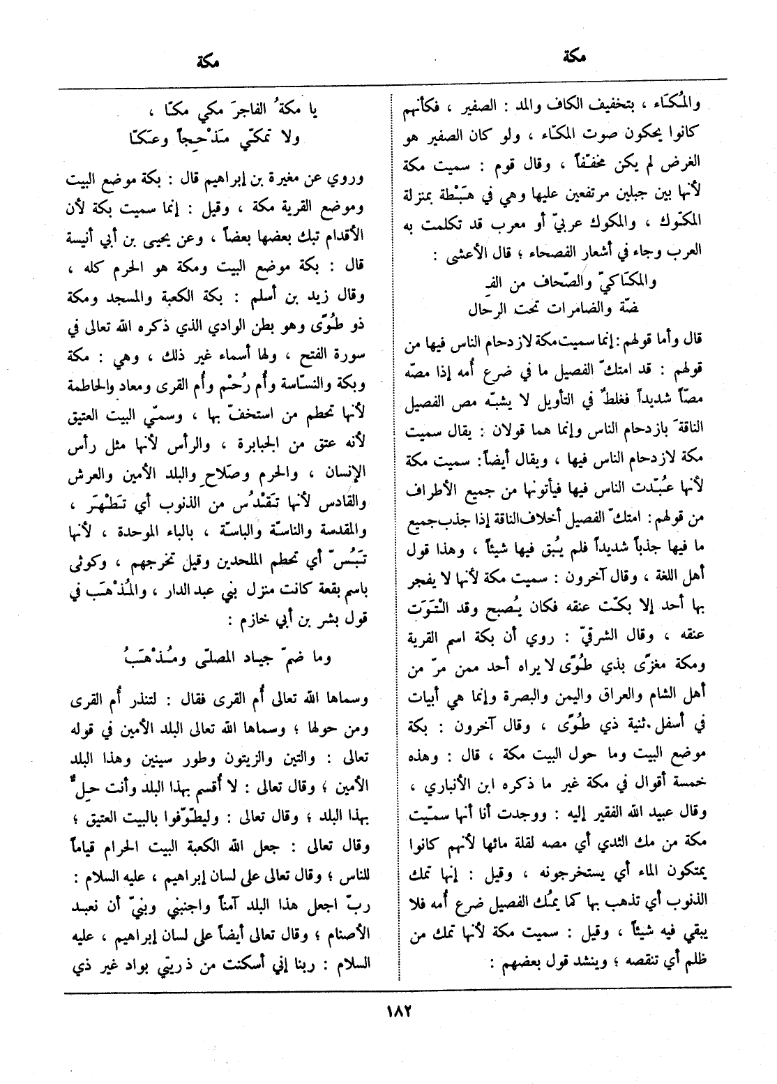 قال وأما قولهم: إنما سميت مكة لازدحام الناس فيها من قولهم: قد امتكّ الفصيل ما في ضرع أمه إذا مصّه مصّا شديدا فغلط في التأويل لا يشبّه مص الفصيل الناقة بازدحام الناس وإنما هما قولان: يقال سميت مكة لازدحام الناس فيها، ويقال أيضا: سميت مكة لأنها عبّدت الناس فيها فيأتونها من جميع الأطراف من قولهم: امتكّ الفصيل أخلاف الناقة إذا جذب جميع ما فيها جذبا شديدا فلم يبق فيها شيئا، وهذا قول أهل اللغة، وقال آخرون: سميت مكة لأنها لا يفجر بها أحد إلا بكّت عنقه فكان يصبح وقد التوت عنقه، وقال الشرقيّ: روي أن بكة اسم القرية ومكة مغزى بذي طوى لا يراه أحد ممن مرّ من أهل الشام والعراق واليمن والبصرة وإنما هي أبيات في أسفل ثنية ذي طوى، وقال آخرون: بكة موضع البيت وما حول البيت مكة، قال: وهذه خمسة أقوال في مكة غير ما ذكره ابن الأنباري، وقال عبيد الله الفقير إليه: ووجدت أنا أنها سمّيت مكة من مك الثدي أي مصه لقلة مائها لأنهم كانوا يمتكون الماء أي يستخرجونه، وقيل: إنها تمك الذنوب أي تذهب بها كما يمك الفصيل ضرع أمه فلا يبقي فيه شيئا، وقيل: سميت مكة لأنها تمك من ظلم أي تنقصه، وينشد قول بعضهم: