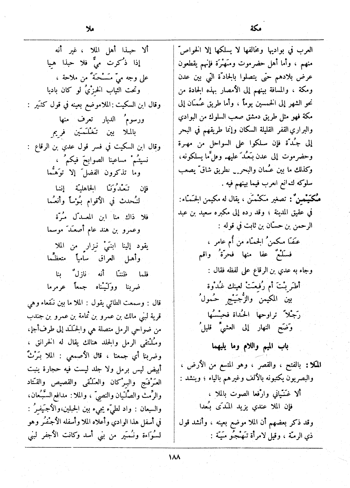 قال: وسمعت الطائي يقول: الملا ما بين نقعاء وهي قرية لبني مالك بن عمرو بن ثمامة بن عمرو بن جندب من ضواحي الرمل متصلة هي والجلد إلى طرف أجإ، وملتقى الرمل والجلد هنالك يقال له الخرانق، وضربنا أي جمعنا، قال الأصمعي: الملا برث أبيض ليس برمل ولا جلد ليست فيه حجارة ينبت العرفج والبركان والعلقى والقصيص والقتاد والرّمث والصّلّيان والنصيّ، والملا: مدافع السّبعان، والسبعان: واد لطيّء يجيء بين الجبلين، والأجيفر: