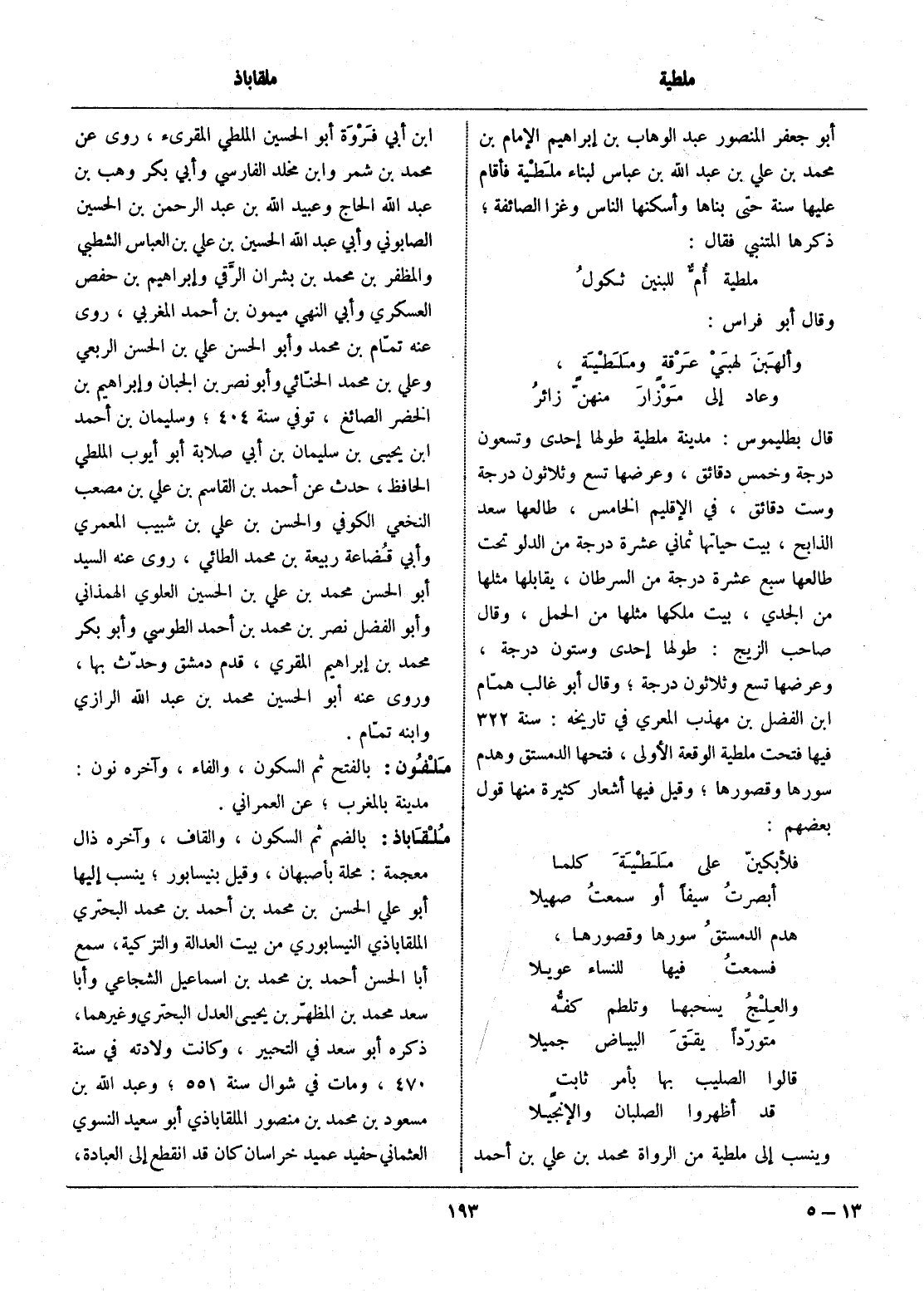 قال بطليموس: مدينة ملطية طولها إحدى وتسعون درجة وخمس دقائق، وعرضها تسع وثلاثون درجة وست دقائق، في الإقليم الخامس، طالعها سعد الذابح، بيت حياتها ثماني عشرة درجة من الدلو تحت طالعها سبع عشرة درجة من السرطان، يقابلها مثلها من الجدي، بيت ملكها مثلها من الحمل، وقال صاحب الزيج: طولها إحدى وستون درجة، وعرضها تسع وثلاثون درجة، وقال أبو غالب همّام ابن الفضل بن مهذب المعري في تاريخه: سنة 322 فيها فتحت ملطية الوقعة الأولى، فتحها الدمستق وهدم سورها وقصورها، وقيل فيها أشعار كثيرة منها قول بعضهم: