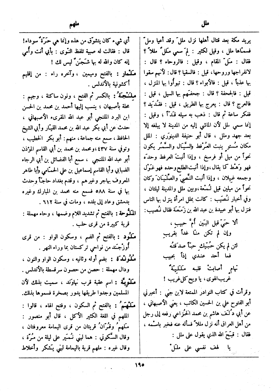 يريد مكة بعد قتال أهلها نزل ملل وقد أعيا وملّ فسمّاها ملل، وقيل لكثير: لم سمي ملل مللا؟