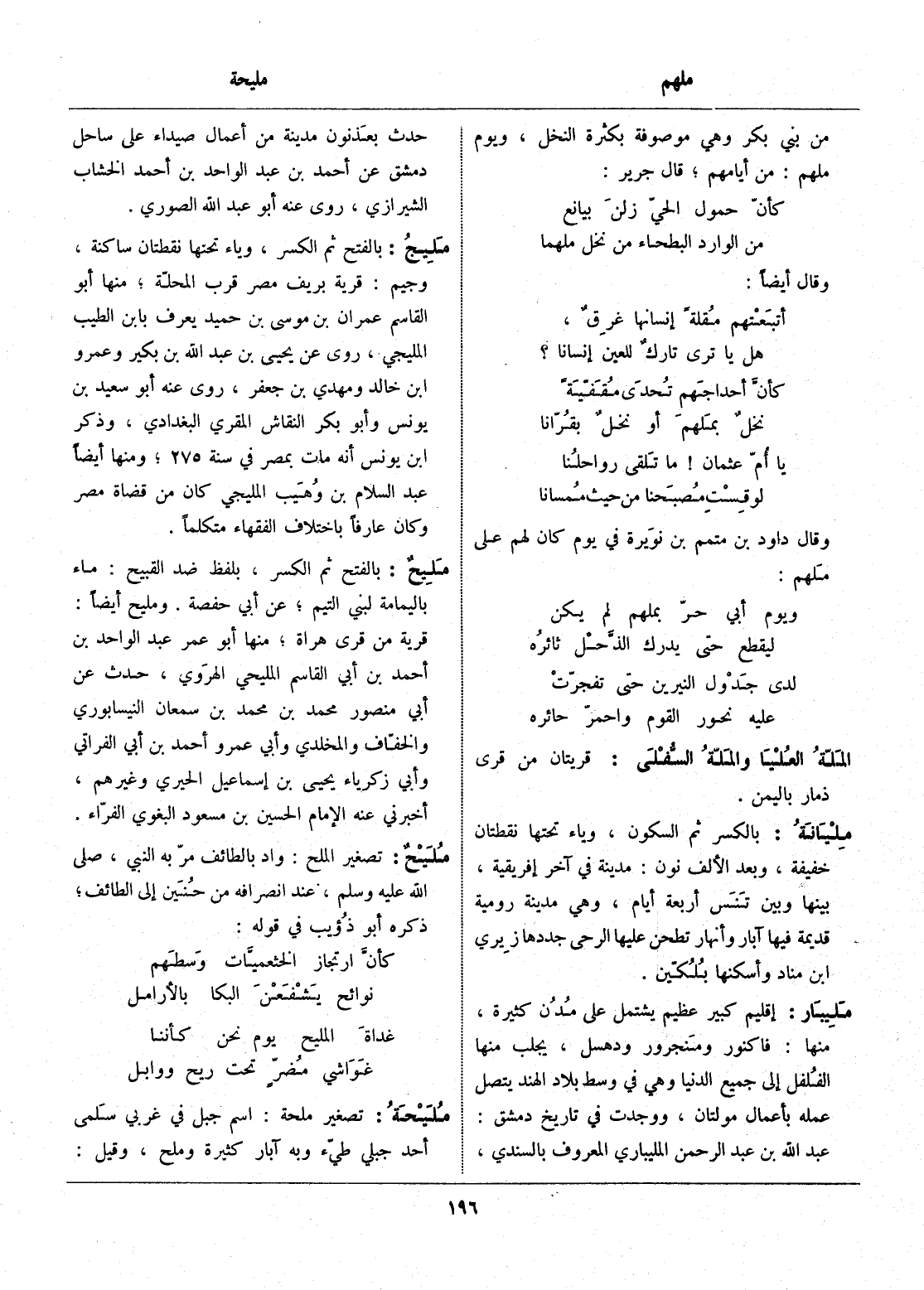 قرية من قرى هراة، منها أبو عمر عبد الواحد بن أحمد بن أبي القاسم المليحي الهروي، حدث عن أبي منصور محمد بن محمد بن سمعان النيسابوري والخفّاف والمخلدي وأبي عمرو أحمد بن أبي الفراتي وأبي زكرياء يحيى بن إسماعيل الحيري وغيرهم، أخبرني عنه الإمام الحسين بن مسعود البغوي الفرّاء.