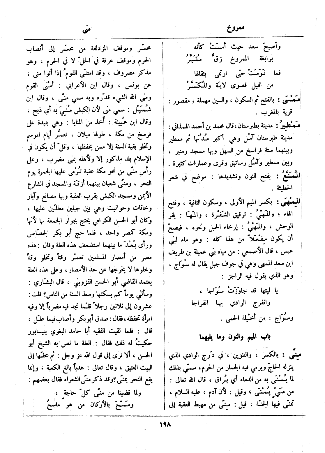 من مَنِيٍّ يُمْنى 75: 37، وقيل: لأن آدم، عليه السّلام، تمنّى فيها الجنّة، قيل: منى من مهبط العقبة إلى محسّر وموقف المزدلفة من محسّر إلى أنصاب الحرم وموقف عرفة في الحلّ لا في الحرم، وهو مذكر مصروف، وقد أمتني القوم إذا أتوا منى، عن يونس، وقال ابن الأعرابي: أمنى القوم ومنى الله الشيء قدّره وبه سمي منى، وقال ابن شميل: سمي منى لأن الكبش مني به أي ذبح، وقال ابن عيينة: أخذ من المنايا: وهي بليدة على فرسخ من مكة، طولها ميلان، تعمّر أيام الموسم وتخلو بقية السنة إلا ممن يحفظها، وقلّ أن يكون في الإسلام بلد مذكور إلا ولأهله بمنى مضرب، وعلى رأس منى من نحو مكة عقبة ترمى عليها الجمرة يوم النحر، ومنى شعبان بينهما أزقّة والمسجد في الشارع الأيمن ومسجد الكبش بقرب العقبة وبها مصانع وآبار وخانات وحوانيت وهي بين جبلين مطلّين عليها، وكان أبو الحسن الكرخي يحتج بجواز الجمعة بها لأنها ومكة كمصر واحد، فلما حج أبو بكر الجصّاص ورأى بعد ما بينهما استضعف هذه العلة وقال: هذه مصر من أمصار المسلمين تعمّر وقتا وتخلو وقتا وخلوها لا يخرجها عن حد الأمصار، وعلى هذه العلة يعتمد القاضي أبو الحسن القزويني، قال البشّاري: