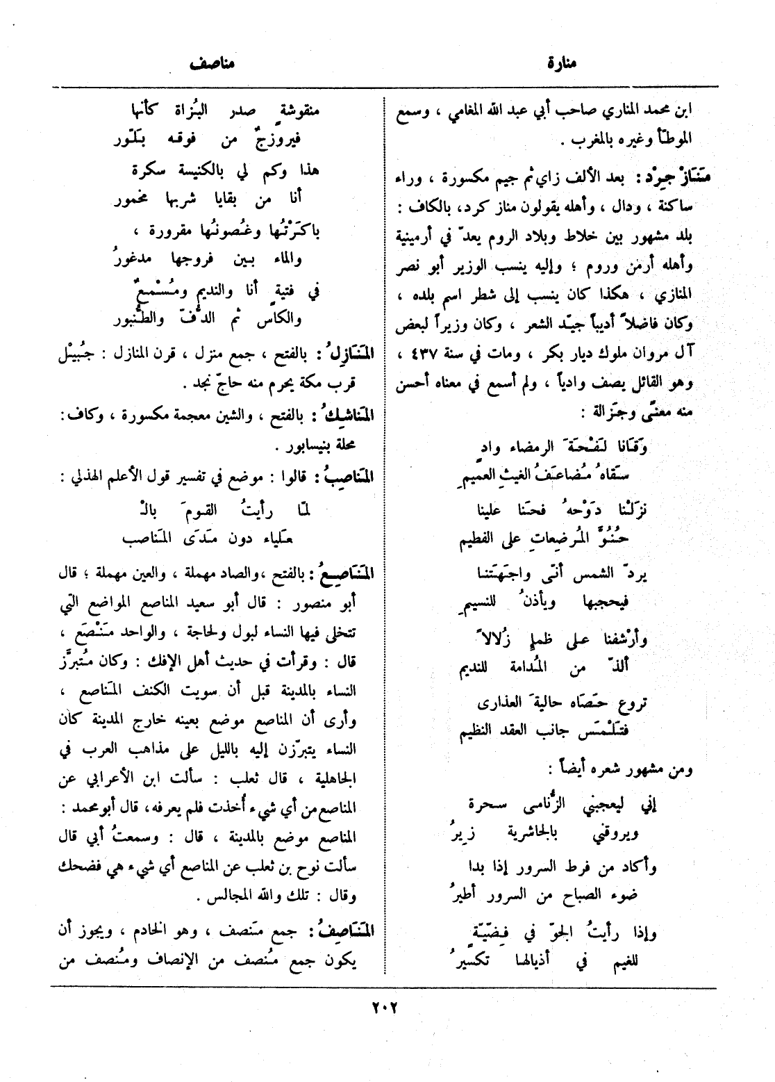 بلد مشهور بين خلاط وبلاد الروم يعدّ في أرمينية وأهله أرمن وروم، وإليه ينسب الوزير أبو نصر المنازي، هكذا كان ينسب إلى شطر اسم بلده، وكان فاضلا أديبا جيّد الشعر، وكان وزيرا لبعض آل مروان ملوك ديار بكر، ومات في سنة 437، وهو القائل يصف واديا، ولم أسمع في معناه أحسن منه معنى وجزالة:
