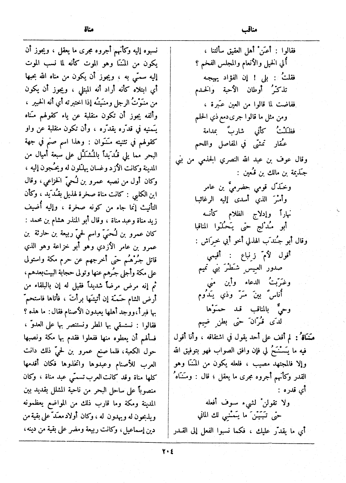 أي ما يقدّر عليك، فكما نسبوا الفعل إلى القدر نسبوه إليه وكأنهم أجروه مجرى ما يعقل، ويجوز أن يكون من المنا وهو الموت كأنه لما نسب الموت إليه سمّي به، ويجوز أن يكون من مناه الله بحبها أي ابتلاه كأنه أراد أنه المبتلي، ويجوز أن يكون من منوت الرجل ومنيته إذا اختبرته أي أنه الخبير، وألفه يجوز أن تكون منقلبة عن ياء كقولهم مناه يمنيه في قدّره يقدّره، وأن تكون منقلبة عن واو كقولهم في تثنيته منوان: وهذا اسم صنم في جهة البحر مما يلي قديدا بالمشلّل على سبعة أميال من المدينة وكانت الأزد وغسان يهلّلون له ويحجون إليه، وكان أول من نصبه عمرو بن لحيّ الخزاعي، وقال ابن الكلبي: كانت مناة صخرة لهذيل بقديد، وكأن التأنيث إنما جاء من كونه صخرة، وإليه أضيف زيد مناة وعبد مناة، وقال أبو المنذر هشام بن محمد: