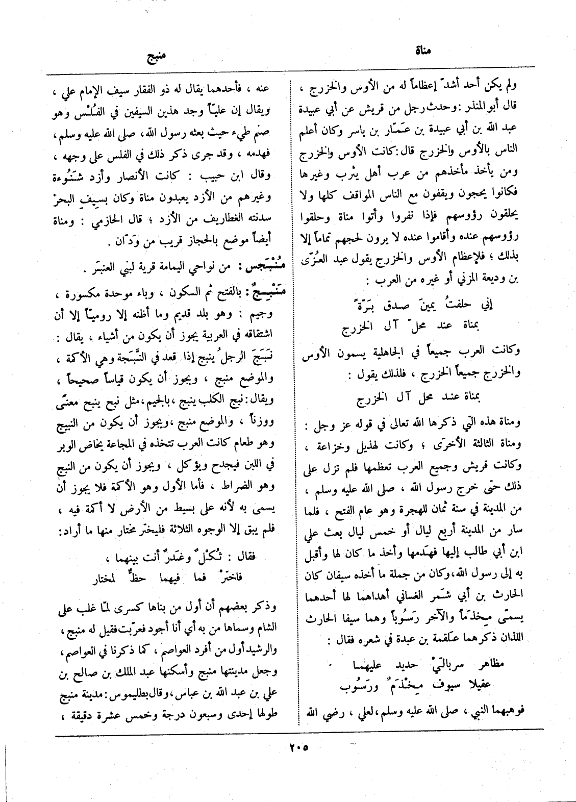 ومناة الثالثة الأخرى، وكانت لهذيل وخزاعة، وكانت قريش وجميع العرب تعظمها فلم تزل على ذلك حتى خرج رسول الله، صلّى الله عليه وسلّم، من المدينة في سنة ثمان للهجرة وهو عام الفتح، فلما سار من المدينة أربع ليال أو خمس ليال بعث علي ابن أبي طالب إليها فهدمها وأخذ ما كان لها وأقبل به إلى رسول الله، وكان من جملة ما أخذه سيفان كان الحارث بن أبي شمر الغساني أهداهما لها أحدهما يسمّى مخذما والآخر رسوبا وهما سيفا الحارث اللذان ذكرهما علقمة بن عبدة في شعره فقال: