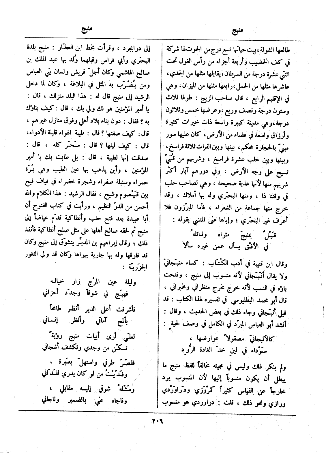 ولم ينكر ذلك وليس في مجيئه مخالفا للفظ منبج ما يبطل أن يكون منسوبا إليها لأن المنسوب يرد خارجا عن القياس كثيرا كمروزي ودراوردي ورازي ونحو ذلك، قلت: دراوردي هو منسوب إلى درابجرد، وقرأت بخط ابن العطّار: منبج بلدة البحتري وأبي فراس وقبلهما ولد بها عبد الملك بن صالح الهاشمي وكان أجلّ قريش ولسان بني العباس ومن يضرب به المثل في البلاغة، وكان لما دخل الرشيد إلى منبج قال له: هذا البلد منزلك، قال: