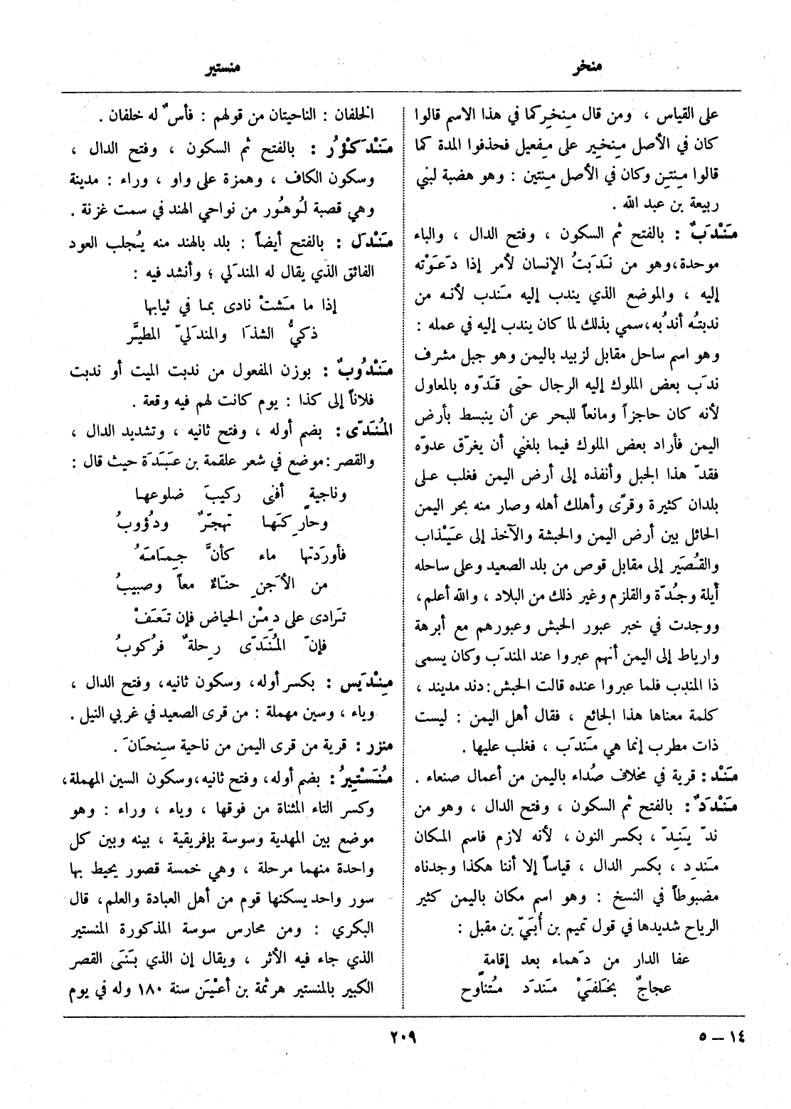 على القياس، ومن قال منخر كما في هذا الاسم قالوا كان في الأصل منخير على مفعيل فحذفوا المدة كما قالوا منتن وكان في الأصل منتين: وهو هضبة لبني ربيعة بن عبد الله.