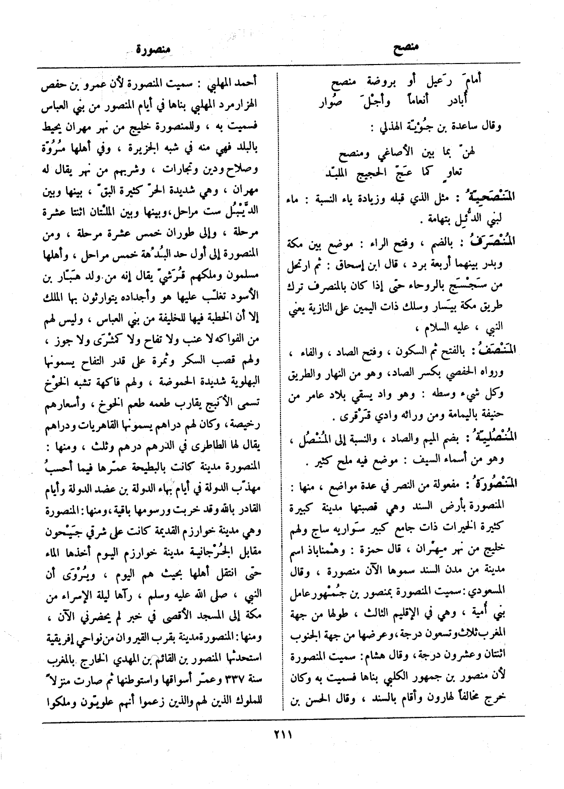 المنصورة بأرض السند وهي قصبتها مدينة كبيرة كثيرة الخيرات ذات جامع كبير سواريه ساج ولهم خليج من نهر مهران، قال حمزة: وهمناباذ اسم مدينة من مدن السند سموها الآن منصورة، وقال المسعودي: سميت المنصورة بمنصور بن جمهور عامل بني أمية، وهي في الإقليم الثالث، طولها من جهة المغرب ثلاث وتسعون درجة، وعرضها من جهة الجنوب اثنتان وعشرون درجة، وقال هشام: سميت المنصورة لأن منصور بن جمهور الكلبي بناها فسميت به وكان خرج مخالفا لهارون وأقام بالسند، وقال الحسن بن أحمد المهلبي: سميت المنصورة لأن عمرو بن حفص الهزارمرد المهلبي بناها في أيام المنصور من بني العباس فسميت به، وللمنصورة خليج من نهر مهران يحيط بالبلد فهي منه في شبه الجزيرة، وفي أهلها مروّة وصلاح ودين وتجارات، وشربهم من نهر يقال له مهران، وهي شديدة الحرّ كثيرة البقّ، بينها وبين الدّيبل ست مراحل، وبينها وبين الملتان اثنتا عشرة مرحلة، وإلى طوران خمس عشرة مرحلة، ومن المنصورة إلى أول حد البدهة خمس مراحل، وأهلها مسلمون وملكهم قرشيّ يقال إنه من ولد هبّار بن الأسود تغلّب عليها هو وأجداده يتوارثون بها الملك إلا أن الخطبة فيها للخليفة من بني العباس، وليس لهم من الفواكه لا عنب ولا تفاح ولا كمثرى ولا جوز، ولهم قصب السكر وثمرة على قدر التفاح يسمونها البهلوية شديدة الحموضة، ولهم فاكهة تشبه الخوخ تسمى الأنبج يقارب طعمه طعم الخوخ، وأسعارهم رخيصة، وكان لهم دراهم يسمونها القاهريات ودراهم يقال لها الطاطري في الدرهم درهم وثلث، ومنها: