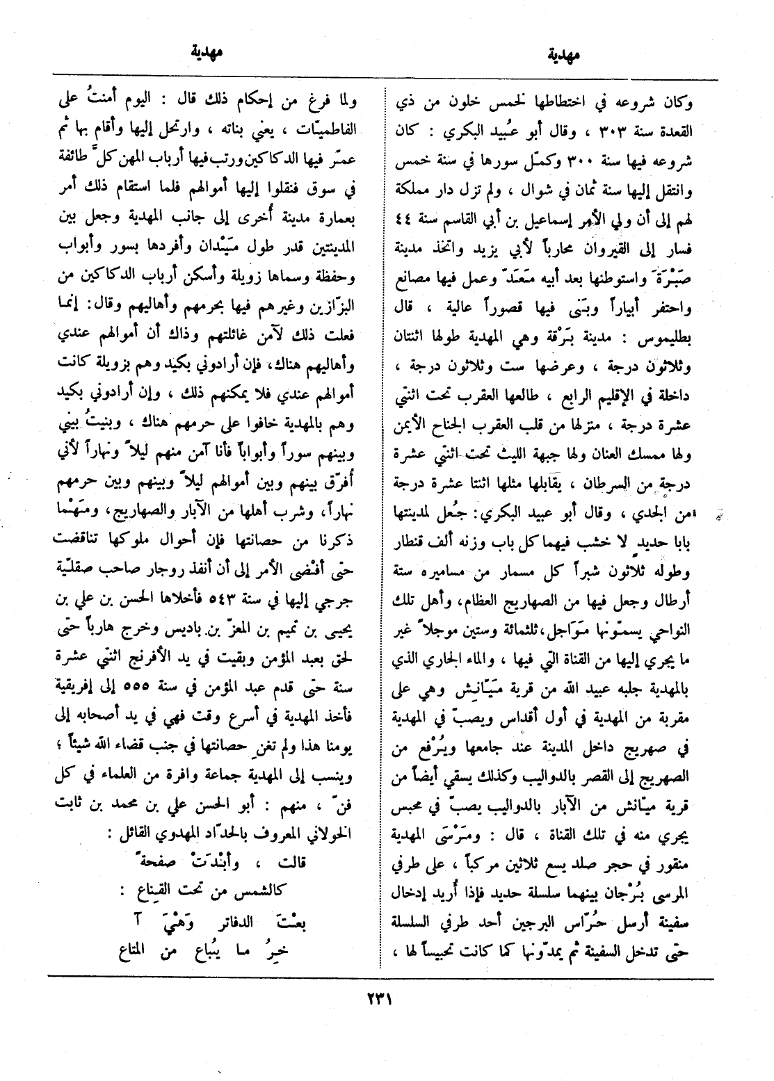 وكان شروعه في اختطاطها لخمس خلون من ذي القعدة سنة 303، وقال أبو عبيد البكري: كان شروعه فيها سنة 300 وكمّل سورها في سنة خمس وانتقل إليها سنة ثمان في شوال، ولم تزل دار مملكة لهم إلى أن ولي الأمر إسماعيل بن أبي القاسم سنة 44 فسار إلى القيروان محاربا لأبي يزيد واتخذ مدينة صبرة واستوطنها بعد أبيه معدّ وعمل فيها مصانع واحتفر أبآرا وبنى فيها قصورا عالية، قال بطليموس: مدينة برقة وهي المهدية طولها اثنتان وثلاثون درجة، وعرضها ست وثلاثون درجة، داخلة في الإقليم الرابع، طالعها العقرب تحت اثنتي عشرة درجة، منزلها من قلب العقرب الجناح الأيمن ولها ممسك العنان ولها جبهة الليث تحت اثنتي عشرة درجة من السرطان، يقابلها مثلها اثنتا عشرة درجة من الجدي، وقال أبو عبيد البكري: جعل لمدينتها بابا حديد لا خشب فيهما كل باب وزنه ألف قنطار وطوله ثلاثون شبرا كل مسمار من مساميره ستة أرطال وجعل فيها من الصهاريج العظام، وأهل تلك النواحي يسمّونها مواجل، ثلاثمائة وستين موجلا غير ما يجري إليها من القناة التي فيها، والماء الجاري الذي بالمهدية جلبه عبيد الله من قرية ميّانش وهي على مقربة من المهدية في أول أقداس ويصبّ في المهدية في صهريج داخل المدينة عند جامعها ويرفع من الصهريج إلى القصر بالدواليب وكذلك يسقي أيضا من قرية ميّانش من الآبار بالدواليب يصبّ في محبس يجري منه في تلك القناة، قال: ومرسى المهدية منقور في حجر صلد يسع ثلاثين مركبا، على طرفي المرسى برجان بينهما سلسلة حديد فإذا أريد إدخال سفينة أرسل حرّاس البرجين أحد طرفي السلسلة حتى تدخل السفينة ثم يمدّونها كما كانت تحبيسا لها، ولما فرغ من إحكام ذلك قال: اليوم أمنت على الفاطميّات، يعني بناته، وارتحل إليها وأقام بها ثم عمّر فيها الدكاكين ورتب فيها أرباب المهن كلّ طائفة في سوق فنقلوا إليها أموالهم فلما استقام ذلك أمر بعمارة مدينة أخرى إلى جانب المهدية وجعل بين المدينتين قدر طول ميدان وأفردها بسور وأبواب وحفظة وسماها زويلة وأسكن أرباب الدكاكين من البزّازين وغيرهم فيها بحرمهم وأهاليهم وقال: إنما فعلت ذلك لآمن غائلتهم وذاك أن أموالهم عندي وأهاليهم هناك، فإن أرادوني بكيد وهم بزويلة كانت أموالهم عندي فلا يمكنهم ذلك، وإن أرادوني بكيد وهم بالمهدية خافوا على حرمهم هناك، وبنيت بيني وبينهم سورا وأبوابا فأنا آمن منهم ليلا ونهارا لأني أفرّق بينهم وبين أموالهم ليلا وبينهم وبين حرمهم نهارا، وشرب أهلها من الآبار والصهاريج، ومهما ذكرنا من حصانتها فإن أحوال ملوكها تناقضت حتى أفضى الأمر إلى أن أنفذ روجار صاحب صقليّة جرجي إليها في سنة 543 فأخلاها الحسن بن علي بن يحيى بن تميم بن المعزّ بن باديس وخرج هاربا حتى لحق بعبد المؤمن وبقيت في يد الأفرنج اثنتي عشرة سنة حتى قدم عبد المؤمن في سنة 555 إلى إفريقية فأخذ المهدية في أسرع وقت فهي في يد أصحابه إلى يومنا هذا ولم تغن حصانتها في جنب قضاء الله شيئا، وينسب إلى المهدية جماعة وافرة من العلماء في كل فنّ، منهم: أبو الحسن علي بن محمد بن ثابت الخولاني المعروف بالحدّاد المهدوي القائل: