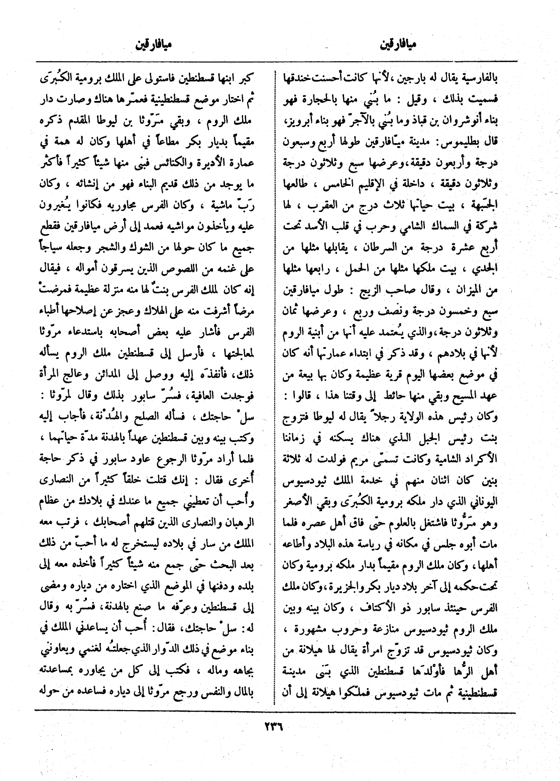 وكان رئيس هذه الولاية رجلا يقال له ليوطا فتزوج بنت رئيس الجبل الذي هناك يسكنه في زماننا الأكراد الشامية وكانت تسمّى مريم فولدت له ثلاثة بنين كان اثنان منهم في خدمة الملك ثيودسيوس اليوناني الذي دار ملكه برومية الكبرى وبقي الأصغر وهو مرّوثا فاشتغل بالعلوم حتى فاق أهل عصره فلما مات أبوه جلس في مكانه في رياسة هذه البلاد وأطاعه أهلها، وكان ملك الروم مقيما بدار ملكه برومية وكان تحت حكمه إلى آخر بلاد ديار بكر والجزيرة، وكان ملك الفرس حينئذ سابور ذو الأكتاف، وكان بينه وبين ملك الروم ثيودسيوس منازعة وحروب مشهورة، وكان ثيودسيوس قد تزوّج امرأة يقال لها هيلانة من أهل الرّها فأولدها قسطنطين الذي بنى مدينة قسطنطينية ثم مات ثيودسيوس فملّكوا هيلانة إلى أن كبر ابنها قسطنطين فاستولى على الملك برومية الكبرى ثم اختار موضع قسطنطينية فعمّرها هناك وصارت دار ملك الروم، وبقي مرّوثا بن ليوطا المقدم ذكره مقيما بديار بكر مطاعا في أهلها وكان له همة في عمارة الأديرة والكنائس فبنى منها شيئا كثيرا فأكثر ما يوجد من ذلك قديم البناء فهو من إنشائه، وكان ربّ ماشية، وكان الفرس مجاوريه فكانوا يغيرون عليه ويأخذون مواشيه فعمد إلى أرض ميافارقين فقطع جميع ما كان حولها من الشوك والشجر وجعله سياجا على غنمه من اللصوص الذين يسرقون أمواله، فيقال إنه كان لملك الفرس بنت لها منه منزلة عظيمة فمرضت مرضا أشرفت منه على الهلاك وعجز عن إصلاحها أطباء الفرس فأشار عليه بعض أصحابه باستدعاء مرّوثا لمعالجتها، فأرسل إلى قسطنطين ملك الروم يسأله ذلك، فأنفذه إليه ووصل إلى المدائن وعالج المرأة فوجدت العافية، فسرّ سابور بذلك وقال لمرّوثا: