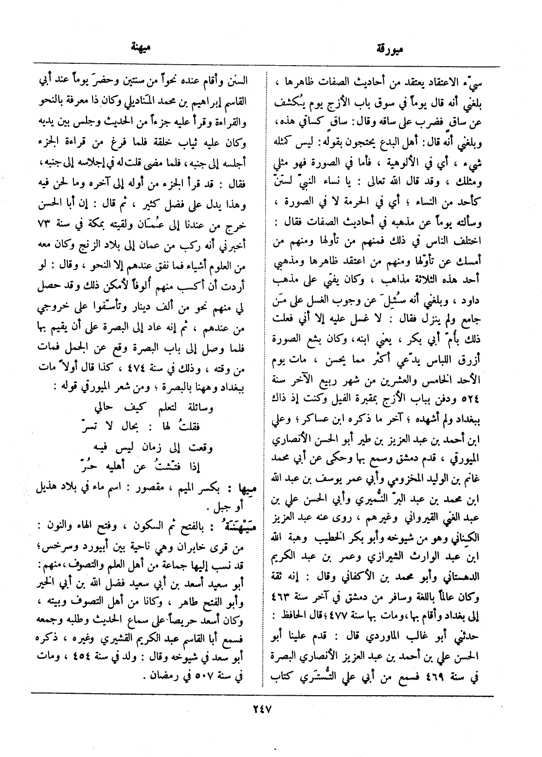 اختلف الناس في ذلك فمنهم من تأولها ومنهم من أمسك عن تأوّلها ومنهم من اعتقد ظاهرها ومذهبي أحد هذه الثلاثة مذاهب، وكان يفتي على مذهب داود، وبلغني أنه سئل عن وجوب الغسل على من جامع ولم ينزل فقال: لا غسل عليه إلا أني فعلت ذلك بأمّ أبي بكر، يعني ابنه، وكان بشع الصورة أزرق اللباس يدّعي أكثر مما يحسن، مات يوم الأحد الخامس والعشرين من شهر ربيع الآخر سنة 524 ودفن بباب الأزج بمقبرة الفيل وكنت إذ ذاك ببغداد ولم أشهده، آخر ما ذكره ابن عساكر، وعلي ابن أحمد بن عبد العزيز بن طير أبو الحسن الأنصاري الميورقي، قدم دمشق وسمع بها وحكى عن أبي محمد غانم بن الوليد المخزومي وأبي عمر يوسف بن عبد الله ابن محمد بن عبد البرّ النّميري وأبي الحسن علي بن عبد الغني القيرواني وغيرهم، روى عنه عبد العزيز الكناني وهو من شيوخه وأبو بكر الخطيب وهبة الله ابن عبد الوارث الشيرازي وعمر بن عبد الكريم الدهستاني وأبو محمد بن الأكفاني وقال: إنه ثقة وكان عالما باللغة وسافر من دمشق في آخر سنة 463 إلى بغداد وأقام بها، ومات بها سنة 477، قال الحافظ: