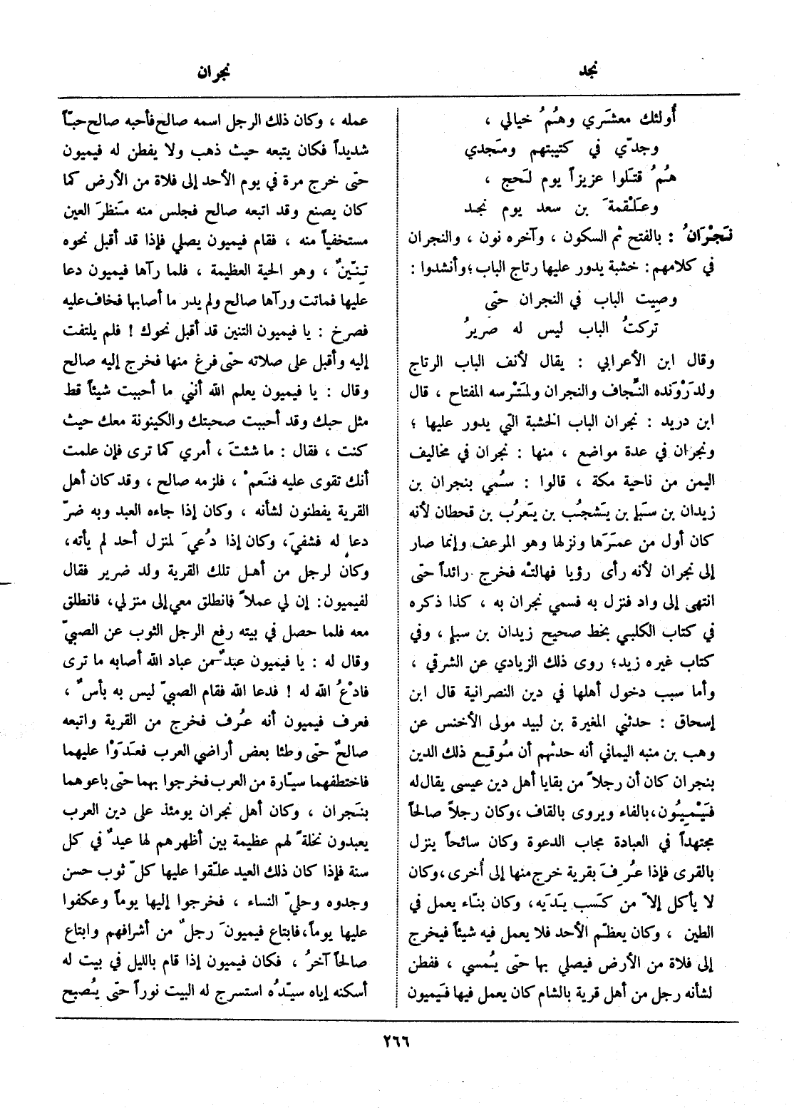 وقال ابن الأعرابي: يقال لأنف الباب الرتاج ولد رونده النّجاف والنجران ولمترسه المفتاح، قال ابن دريد: نجران الباب الخشبة التي يدور عليها، ونجران في عدة مواضع، منها: نجران في مخاليف اليمن من ناحية مكة، قالوا: سمي بنجران بن زيدان بن سبإ بن يشجب بن يعرب بن قحطان لأنه كان أول من عمرها ونزلها وهو المرعف وإنما صار إلى نجران لأنه رأى رؤيا فهالته فخرج رائدا حتى انتهى إلى واد فنزل به فسمي نجران به، كذا ذكره في كتاب الكلبي بخط صحيح زيدان بن سبإ، وفي كتاب غيره زيد، روى ذلك الزيادي عن الشرقي، وأما سبب دخول أهلها في دين النصرانية قال ابن إسحاق: حدثني المغيرة بن لبيد مولى الأخنس عن وهب بن منبه اليماني أنه حدثهم أن موقع ذلك الدين بنجران كان أن رجلا من بقايا أهل دين عيسى يقال له فيميون، بالفاء ويروى بالقاف، وكان رجلا صالحا مجتهدا في العبادة مجاب الدعوة وكان سائحا ينزل بالقرى فإذا عرف بقرية خرج منها إلى أخرى، وكان لا يأكل إلّا من كسب يديه، وكان بنّاء يعمل في الطين، وكان يعظّم الأحد فلا يعمل فيه شيئا فيخرج إلى فلاة من الأرض فيصلي بها حتى يمسي، ففطن لشأنه رجل من أهل قرية بالشام كان يعمل فيها فيميون عمله، وكان ذلك الرجل اسمه صالح فأحبه صالح حبّا شديدا فكان يتبعه حيث ذهب ولا يفطن له فيميون حتى خرج مرة في يوم الأحد إلى فلاة من الأرض كما كان يصنع وقد اتبعه صالح فجلس منه منظر العين مستخفيا منه، فقام فيميون يصلي فإذا قد أقبل نحوه تنّين، وهو الحية العظيمة، فلما رآها فيميون دعا عليها فماتت ورآها صالح ولم يدر ما أصابها فخاف عليه فصرخ: يا فيميون التنين قد أقبل نحوك! فلم يلتفت إليه وأقبل على صلاته حتى فرغ منها فخرج إليه صالح وقال: يا فيميون يعلم الله أنني ما أحببت شيئا قط مثل حبك وقد أحببت صحبتك والكينونة معك حيث كنت، فقال: ما شئت، أمري كما ترى فإن علمت أنك تقوى عليه فنعم، فلزمه صالح، وقد كان أهل القرية يفطنون لشأنه، وكان إذا جاءه العبد وبه ضرّ دعا له فشفي، وكان إذا دعي لمنزل أحد لم يأته، وكان لرجل من أهل تلك القرية ولد ضرير فقال لفيميون: إن لي عملا فانطلق معي إلى منزلي، فانطلق معه فلما حصل في بيته رفع الرجل الثوب عن الصبيّ وقال له: يا فيميون عبد من عباد الله أصابه ما ترى فادع الله له! فدعا الله فقام الصبيّ ليس به بأس، فعرف فيميون أنه عرف فخرج من القرية واتبعه صالح حتى وطئا بعض أراضي العرب فعدوا عليهما فاختطفهما سيّارة من العرب فخرجوا بهما حتى باعوهما بنجران، وكان أهل نجران يومئذ على دين العرب يعبدون نخلة لهم عظيمة بين أظهرهم لها عيد في كل سنة فإذا كان ذلك العيد علّقوا عليها كلّ ثوب حسن وجدوه وحليّ النساء، فخرجوا إليها يوما وعكفوا عليها يوما، فابتاع فيميون رجل من أشرافهم وابتاع صالحا آخر، فكان فيميون إذا قام بالليل في بيت له أسكنه إياه سيّده استسرج له البيت نورا حتى يصبح