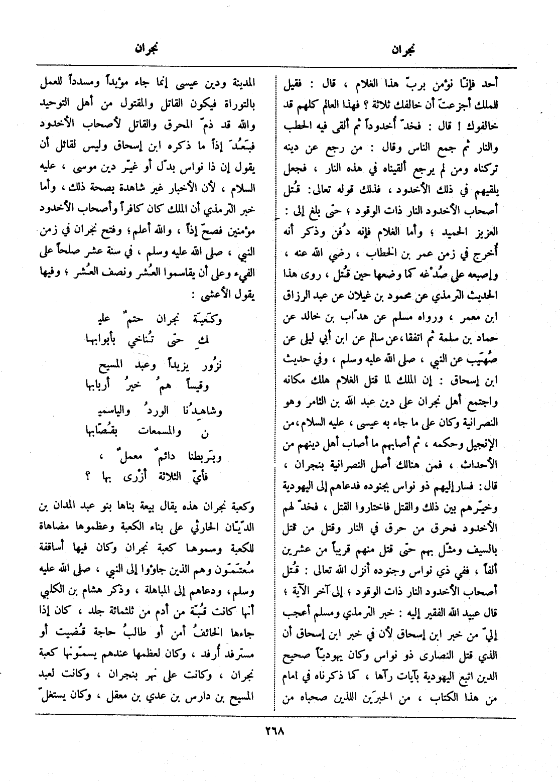 العزيز الحميد، وأما الغلام فإنه دفن وذكر أنه أخرج في زمن عمر بن الخطاب، رضي الله عنه، وإصبعه على صدغه كما وضعها حين قتل، روى هذا الحديث الترمذي عن محمود بن غيلان عن عبد الرزاق ابن معمر، ورواه مسلم عن هدّاب بن خالد عن حماد بن سلمة ثم اتفقا، عن سالم عن ابن أبي ليلى عن صهيب عن النبي، صلّى الله عليه وسلّم، وفي حديث ابن إسحاق: إن الملك لما قتل الغلام هلك مكانه واجتمع أهل نجران على دين عبد الله بن الثامر وهو النصرانية وكان على ما جاء به عيسى، عليه السّلام، من الإنجيل وحكمه، ثم أصابهم ما أصاب أهل دينهم من الأحداث، فمن هنالك أصل النصرانية بنجران، قال: فسار إليهم ذو نواس بجنوده فدعاهم إلى اليهودية وخيّرهم بين ذلك والقتل فاختاروا القتل، فخدّ لهم الأخدود فحرق من حرق في النار وقتل من قتل بالسيف ومثّل بهم حتى قتل منهم قريبا من عشرين ألفا، ففي ذي نواس وجنوده أنزل الله تعالى: قتل أصحاب الأخدود النار ذات الوقود، إلى آخر الآية، قال عبيد الله الفقير إليه: خبر الترمذي ومسلم أعجب إليّ من خبر ابن إسحاق لأن في خبر ابن إسحاق أن الذي قتل النصارى ذو نواس وكان يهوديّا صحيح الدين اتبع اليهودية بآيات رآها، كما ذكرناه في امام من هذا الكتاب، من الحبرين اللذين صحباه من المدينة ودين عيسى إنما جاء مؤيدا ومسددا للعمل بالتوراة فيكون القاتل والمقتول من أهل التوحيد والله قد ذمّ المحرق والقاتل لأصحاب الأخدود فبعد إذا ما ذكره ابن إسحاق وليس لقائل أن يقول إن ذا نواس بدّل أو غيّر دين موسى، عليه السلام، لأن الأخبار غير شاهدة بصحة ذلك، وأما خبر الترمذي أن الملك كان كافرا وأصحاب الأخدود مؤمنين فصحّ إذا، والله أعلم، وفتح نجران في زمن النبي، صلّى الله عليه وسلّم، في سنة عشر صلحا على الفيء وعلى أن يقاسموا العشر ونصف العشر، وفيها يقول الأعشى: