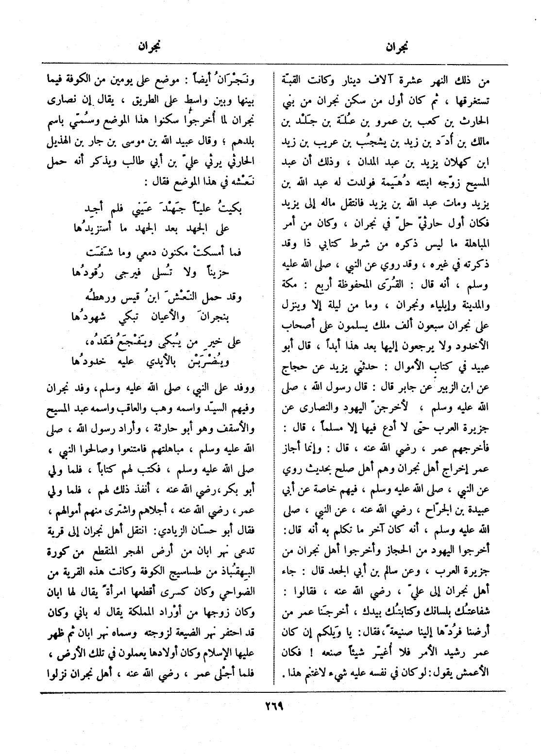 ووفد على النبي، صلّى الله عليه وسلّم، وفد نجران وفيهم السيّد واسمه وهب والعاقب واسمه عبد المسيح والأسقف وهو أبو حارثة، وأراد رسول الله، صلى الله عليه وسلّم، مباهلتهم فامتنعوا وصالحوا النبي، صلّى الله عليه وسلّم، فكتب لهم كتابا، فلما ولي أبو بكر، رضي الله عنه، أنفذ ذلك لهم، فلما ولي عمر، رضي الله عنه، أجلاهم واشترى منهم أموالهم، فقال أبو حسّان الزيادي: انتقل أهل نجران إلى قرية تدعى نهر ابان من أرض الهجر المنقطع من كورة البهقباذ من طساسيج الكوفة وكانت هذه القرية من الضواحي وكان كسرى أقطعها امرأة يقال لها ابان وكان زوجها من أوراد المملكة يقال له باني وكان قد احتفر نهر الضيعة لزوجته وسماه نهر ابان ثم ظهر عليها الإسلام وكان أولادها يعملون في تلك الأرض، فلما أجلى عمر، رضي الله عنه، أهل نجران نزلوا