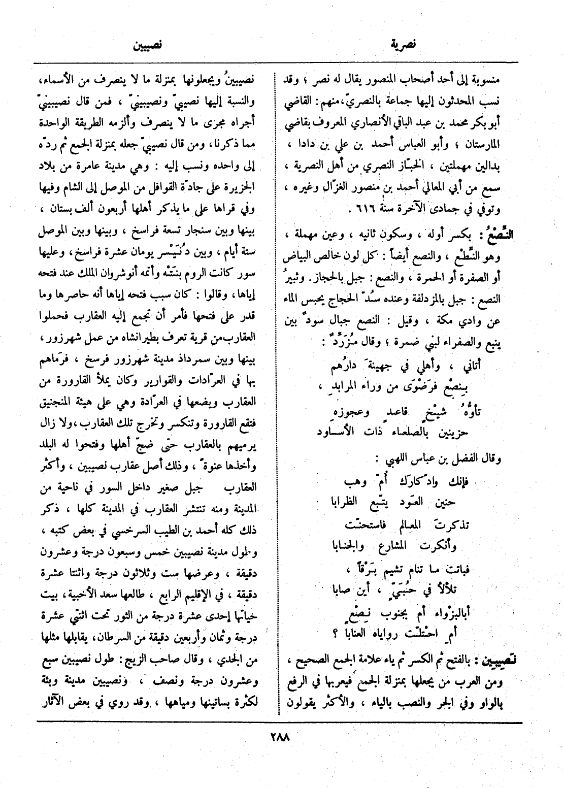 بالفتح ثم الكسر ثم ياء علامة الجمع الصحيح، ومن العرب من يجعلها بمنزلة الجمع فيعربها في الرفع بالواو وفي الجر والنصب بالياء، والأكثر يقولون نصيبين ويجعلونها بمنزلة ما لا ينصرف من الأسماء، والنسبة إليها نصيبيّ ونصيبينيّ، فمن قال نصيبينيّ أجراه مجرى ما لا ينصرف وألزمه الطريقة الواحدة مما ذكرنا، ومن قال نصيبيّ جعله بمنزلة الجمع ثم ردّه إلى واحده ونسب إليه: وهي مدينة عامرة من بلاد الجزيرة على جادّة القوافل من الموصل إلى الشام وفيها وفي قراها على ما يذكر أهلها أربعون ألف بستان، بينها وبين سنجار تسعة فراسخ، وبينها وبين الموصل ستة أيام، وبين دنيسر يومان عشرة فراسخ، وعليها سور كانت الروم بنته وأتمه أنوشروان الملك عند فتحه إياها، وقالوا: كان سبب فتحه إياها أنه حاصرها وما قدر على فتحها فأمر أن تجمع إليه العقارب فحملوا العقارب من قرية تعرف بطيرانشاه من عمل شهرزور بينها وبين سمرداذ مدينة شهرزور فرسخ، فرماهم بها في العرّادات والقوارير وكان يملأ القارورة من العقارب ويضعها في العرّادة وهي على هيئة المنجنيق فتقع القارورة وتنكسر وتخرج تلك العقارب، ولا زال يرميهم بالعقارب حتى ضجّ أهلها وفتحوا له البلد وأخذها عنوة، وذلك أصل عقارب نصيبين، وأكثر العقارب جبل صغير داخل السور في ناحية من المدينة ومنه تنتشر العقارب في المدينة كلها، ذكر ذلك كله أحمد بن الطيب السرخسي في بعض كتبه، وطول مدينة نصيبين خمس وسبعون درجة وعشرون دقيقة، وعرضها ست وثلاثون درجة واثنتا عشرة دقيقة، في الإقليم الرابع، طالعها سعد الأخبية، بيت حياتها إحدى عشرة درجة من الثور تحت اثنتي عشرة درجة وثمان وأربعين دقيقة من السرطان، يقابلها مثلها من الجدي، وقال صاحب الزيج: طول نصيبين سبع وعشرون درجة ونصف، ونصيبين مدينة وبئة لكثرة بساتينها ومياهها، وقد روي في بعض الآثار