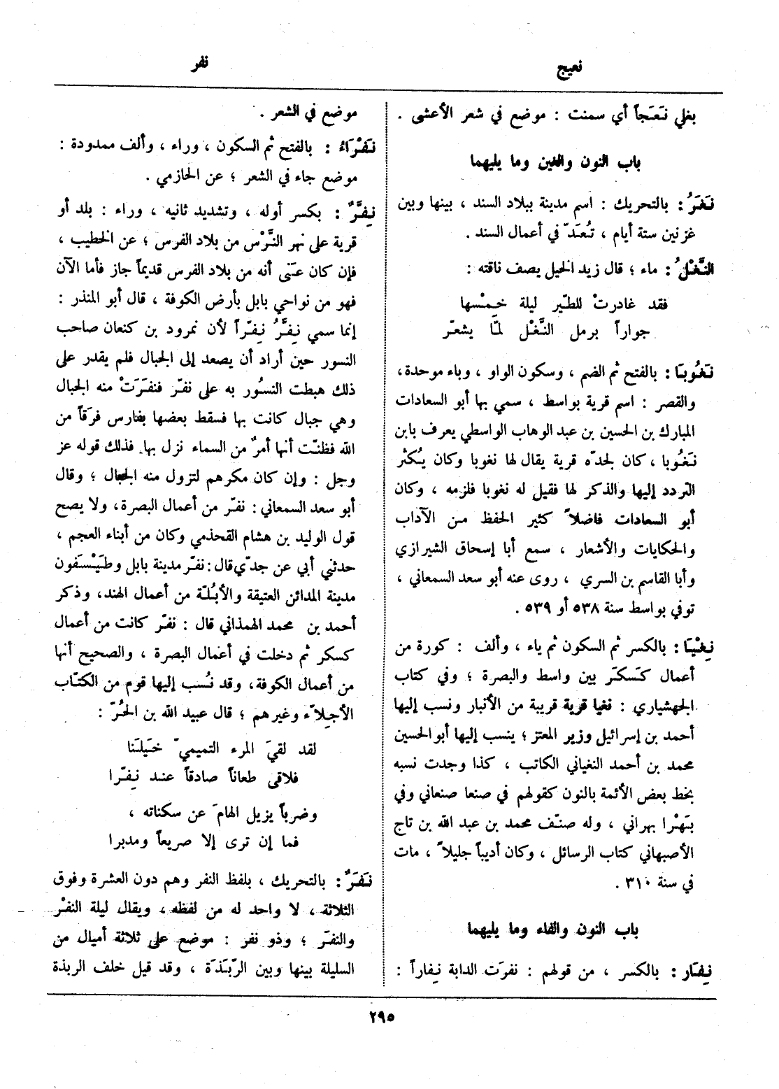 إنما سمي نفّر نفّرا لأن نمرود بن كنعان صاحب النسور حين أراد أن يصعد إلى الجبال فلم يقدر على ذلك هبطت النسور به على نفّر فنفرت منه الجبال وهي جبال كانت بها فسقط بعضها بفارس فرقا من الله فظنّت أنها أمر من السماء نزل بها فذلك قوله عز وجل: وإن كان مكرهم لتزول منه الجبال، وقال أبو سعد السمعاني: نفّر من أعمال البصرة، ولا يصح قول الوليد بن هشام القحذمي وكان من أبناء العجم، حدثني أبي عن جدّي قال: نفّر مدينة بابل وطيسفون مدينة المدائن العتيقة والأبلّة من أعمال الهند، وذكر أحمد بن محمد الهمذاني قال: نفّر كانت من أعمال كسكر ثم دخلت في أعمال البصرة، والصحيح أنها من أعمال الكوفة، وقد نسب إليها قوم من الكتّاب الأجلّاء وغيرهم، قال عبيد الله بن الحرّ: