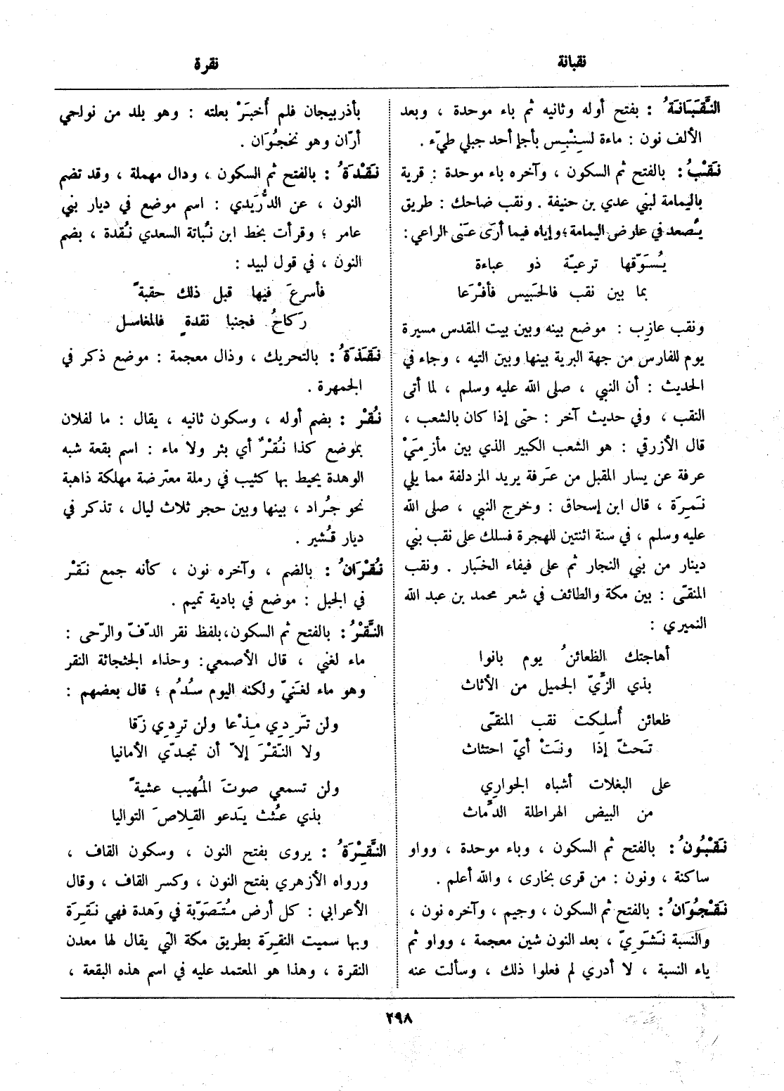 ونقب عازب: موضع بينه وبين بيت المقدس مسيرة يوم للفارس من جهة البرية بينها وبين التيه، وجاء في الحديث: أن النبي، صلّى الله عليه وسلّم، لما أتى النقب، وفي حديث آخر: حتى إذا كان بالشعب، قال الأزرقي: هو الشعب الكبير الذي بين مأزمي عرفة عن يسار المقبل من عرفة يريد المزدلفة مما يلي نمرة، قال ابن إسحاق: وخرج النبي، صلى الله عليه وسلم، في سنة اثنتين للهجرة فسلك على نقب بني دينار من بني النجار ثم على فيفاء الخبار: ونقب المنقّى: بين مكة والطائف في شعر محمد بن عبد الله النميري: