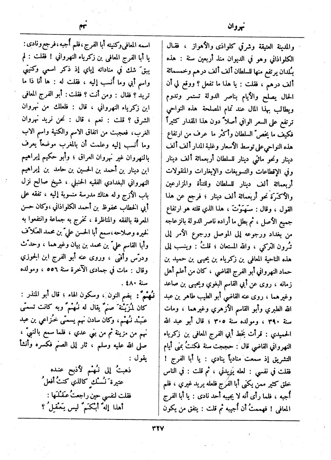 والمدينة العتيقة وشرقي كلواذى والأهواز.، فقال الكلواذاني وهو في الديوان منذ أربعين سنة: هذه بلدان يرتفع منها للسلطان ألف ألف درهم وخمسمائة ألف درهم، فقلت: يا هذا ما تفعل؟ ووقع لي أن الحال يصلح والأيام بناصر الدولة تستمر وتدوم ويطالب بهذا المال عند تمام المصلحة هذه النواحي ترتفع على السعر الوافي أصلا دون هذا المقدار كثيرا فكيف ما يخصّ السلطان وأكثر ما عرف من ارتفاع هذه النواحي على توسط الأسعار وغلبة المدار ألف ألف دينار ونحو مائتي دينار للسلطان أربعمائة ألف دينار وفي الإقطاعات والتسويغات والإيغارات والمنقولات أربعمائة ألف دينار للسلطان وللتناء والمزارعين والأكرة نحو أربعمائة ألف دينار، فرجع عن هذا القول، وقال: سهوت، هذا الذي قلته هو ارتفاع جميع الأصل، ثم بطل ما أراده ناصر الدولة بانزعاجه من بغداد ورجوعه إلى الموصل ورجوع الأمر إلى ترون التركي، والله المستعان، قلت: وينسب إلى هذه الناحية المعافى بن زكرياء بن يحيى بن حميد بن حماد النهرواني أبو الفرج القاضي، كان من أعلم أهل زمانه، روى عن أبي القاسم البغوي ويحيى بن صاعد وغيرهما، روى عنه القاضي أبو الطيب طاهر بن عبد الله الطبري وأبو القاسم الأزهري وغيرهما، ومات سنة 390، ومولده سنة 305، قال أبو عبد الله الحميدي: قرأت بخط أبي الفرج المعافى بن زكرياء النهرواني القاضي قال: حججت سنة فكنت بمنى أيام التشريق إذ سمعت مناديا ينادي: يا أبا الفرج! فقلت في نفسي: لعله يريدني، ثم قلت: في الناس خلق كثير ممن يكنى أبا الفرج فلعله يريد غيري، فلم أجبه، فلما رأى أنه لا يجيبه أحد نادى: يا أبا الفرج المعافى! فهممت أن أجيبه ثم قلت: يتفق من يكون اسمه المعافى وكنيته أبا الفرج، فلم أجبه، فرجع ونادى: