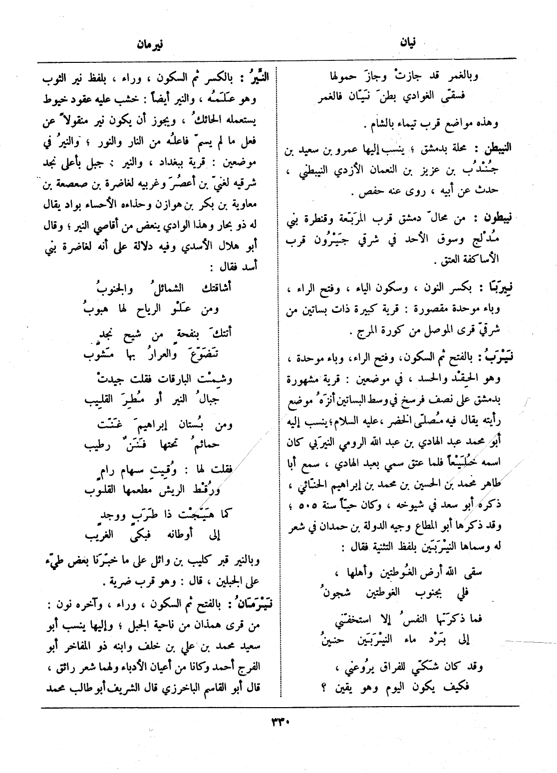 بالكسر ثم السكون، وراء، بلفظ نير الثوب وهو علمه، والنير أيضا: خشب عليه عقود خيوط يستعمله الحائك، ويجوز أن يكون نير منقولا عن فعل ما لم يسمّ فاعله من النار والنور، والنير في موضعين: قرية ببغداد، والنير: جبل بأعلى نجد شرقيه لغنيّ بن أعصر وغربيه لغاضرة بن صعصعة بن معاوية بن بكر بن هوازن وحذاءه الأحساء بواد يقال له ذو بحار وهذا الوادي ينعض من أقاصي النير، وقال أبو هلال الأسدي وفيه دلالة على أنه لغاضرة بني أسد فقال: