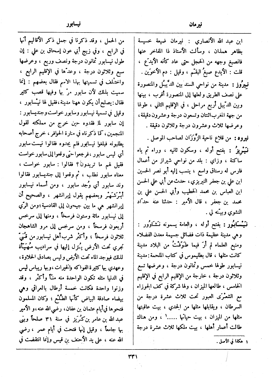 وهي مدينة عظيمة ذات فضائل جسيمة معدن الفضلاء ومنبع العلماء لم أر فيما طوّفت من البلاد مدينة ومنبع العلماء لم أر فيما طوّفت من البلاد مدينة كانت مثلها، قال بطليموس في كتاب الملحمة: مدينة نيسابور طولها خمس وثمانون درجة، وعرضها تسع وثلاثون درجة، خارجة من الإقليم الرابع في الإقليم الخامس، طالعها الميزان، ولها شركة في كف الجوزاء مع الشعرى العبور تحت ثلاث عشرة درجة من السرطان، ويقابلها مثلها من الجدي، بيت عاقبتها مثلها من الميزان، بيت حياتها ... [1] ، ومن هناك طالت أعمار أهلها، بيت ملكها ثلاث عشرة درجة من الحمل، وقد ذكرنا في جمل ذكر الأقاليم أنها في الرابع، وفي زيج أبي عون إسحاق بن علي: إن طول نيسابور ثمانون درجة ونصف وربع، وعرضها سبع وثلاثون درجة، وعدّها في الإقليم الرابع، واختلف في تسميتها بهذا الاسم فقال بعضهم: إنما سميت بذلك لأن سابور مرّ بها وفيها قصب كثير فقال: يصلح أن يكون ههنا مدينة، فقيل لها نيسابور، وقيل في تسمية نيسابور وسابور خواست وجنديسابور: